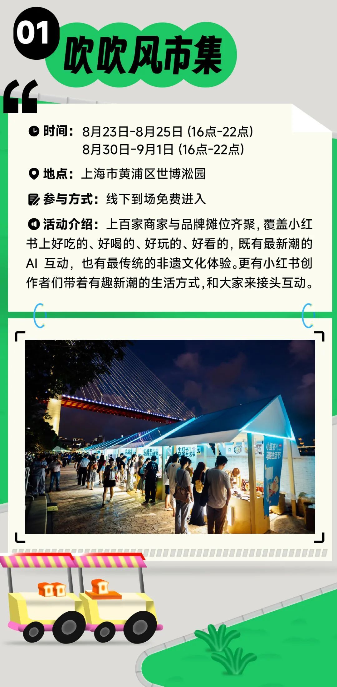 作为“上海之夏”七大标杆活动之一,小红书第二届马路生活节于8月23日至9月1日期间精彩呈现,一个中心化市集和5大主题小马路装饰一新,超过200场主题活动将在上海街头轮番“上演”。其中既有落日音乐会、抬头艺术展等文艺活动,也有时髦秀场、吹吹风市集、逛吃小马路等休闲娱乐,这些丰富多彩的活动,让人感受到上海多元、开放的城市文化。