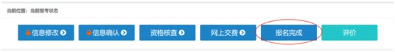 完成缴费和核对后请及时点击【查看当前报考状态】确认报名结果,报名完成按钮显示为蓝色方可视为报名成功。