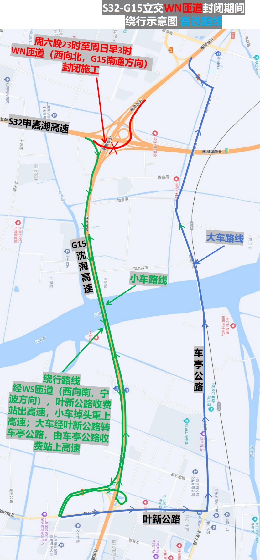 市公安局交警总队介绍,为消除S32申嘉湖高速G15沈海立交部分道路存在的问题,保证行车安全,计划对WN匝道(西向北,嘉兴转南通方向)进行临时封闭。根据施工安排,计划于本周末(8月24日周六晚23时至8月25日周日晨3时),对匝道进行全封闭,对相关道路进行维修,具体信息详见↓ 施工 近年来,S32申嘉湖高速主线流量不断提升,相应收费站及立交匝道的通行负荷不断增大,部分路面出现坑塘、拥包等情况,无法通过日常养护进行修复。为消除S32申嘉湖高速G15沈海立交部分道路存在的问题,保证行车安全,计划对WN匝道(西向北,嘉兴转南通方向)进行临时封闭。 点击可查看大图 根据施工安排,计划于本周末(8月24日周六晚23时至8月25日周日晨3时),对上图所示匝道进行全封闭,对相关道路进行维修,途经车辆可提前从S32松卫北路收费站出高速转松卫北路、泖亭路等经G15车亭公路收费站上高速向北,或经WS匝道(西向南,嘉兴转宁波方向)向南通过G15叶新公路收费站出高速掉头/转车亭公路由G15车亭公路收费站上高速向北。 点击可查看大图 点击可查看大图 建议驾驶人途经施工路段时,结合导航软件,注意按照现场民警指挥和临时交通标志指示进行绕行。