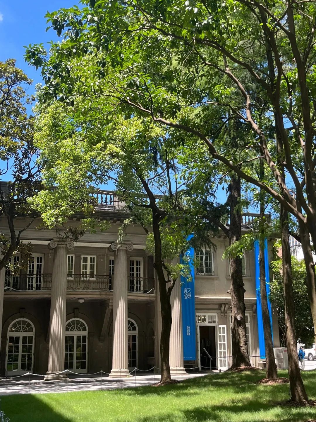 穿过青翠的草坪,映入眼帘的是出自大师邬达克之手的古典欧式建筑;与此形成对比的是,在其后及两侧掩映在绿荫之下的多幢白色现代建筑,与何东旧居交相辉映。