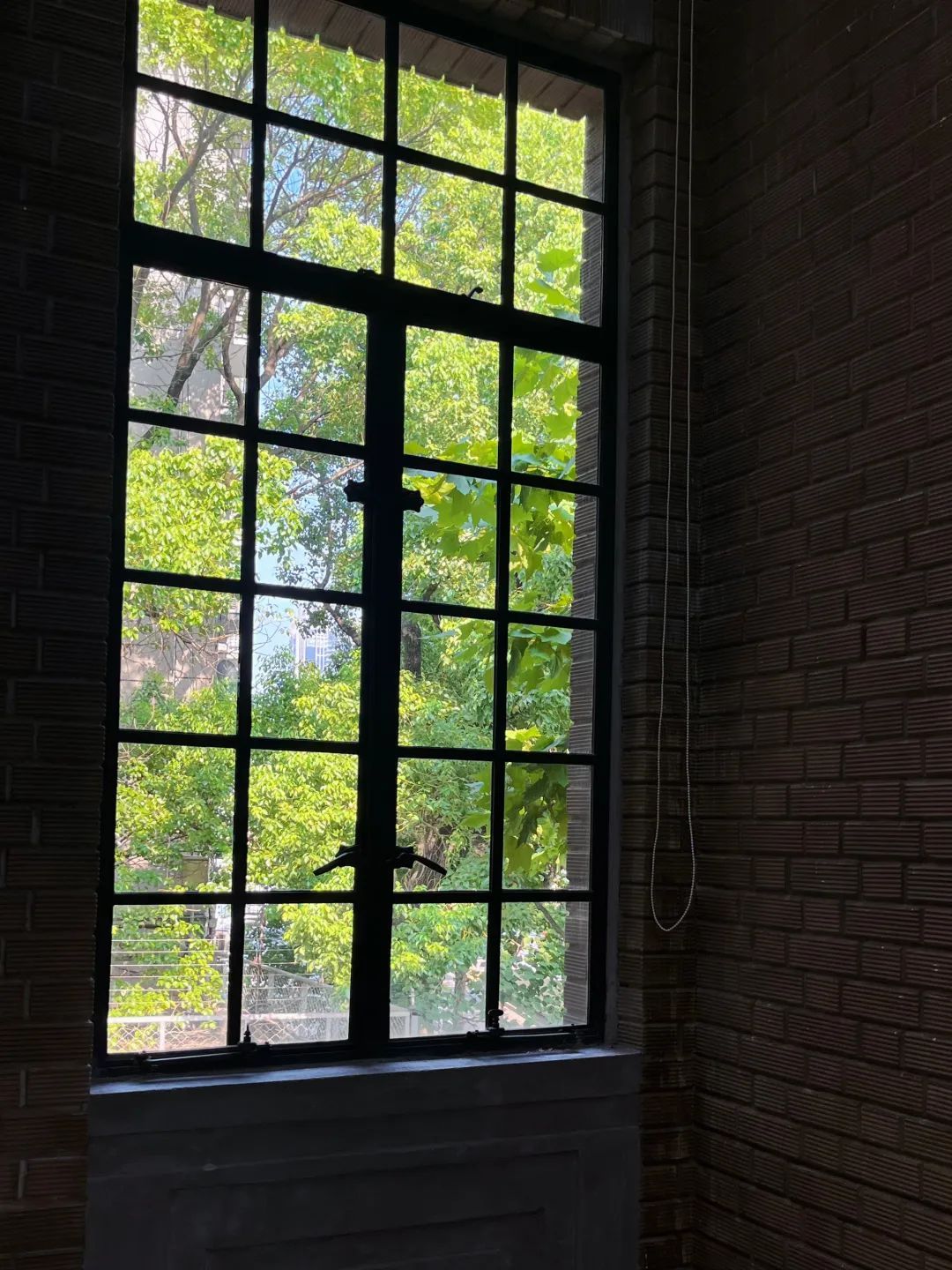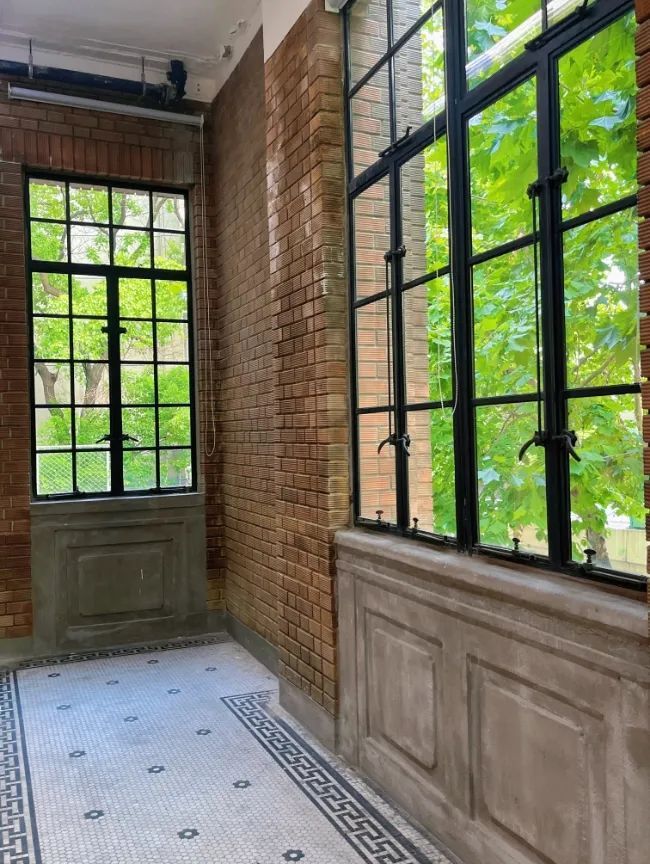 二楼展厅约50米的窗景被绿色光影包围,窗外的梧桐影影绰绰、遮天蔽日,配上老洋房的黑色钢窗结构和红色砖墙,让人仿佛穿梭回上个世纪。