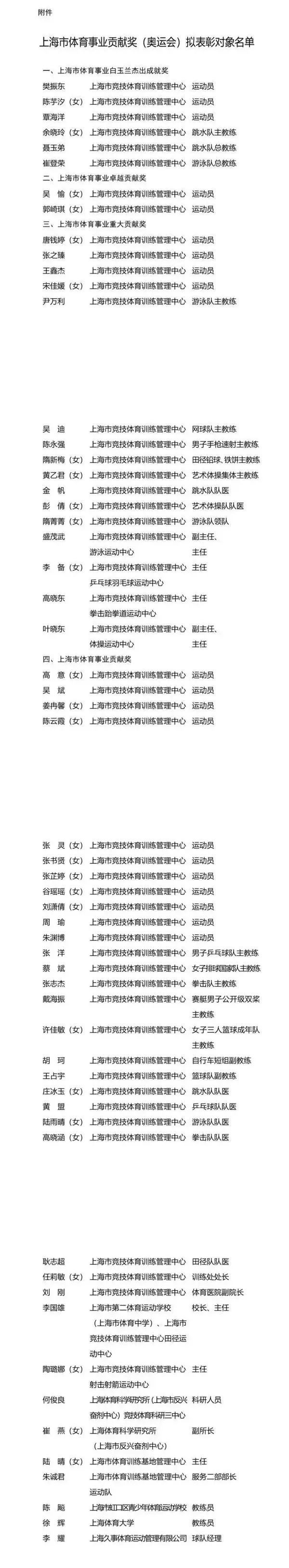 8月23日,上海市体育局发布关于“上海市体育事业贡献奖”拟表彰对象的公示,决定表彰一批在第33届夏季奥林匹克运动会中作出突出贡献的上海运动员、教练员和有关人员。