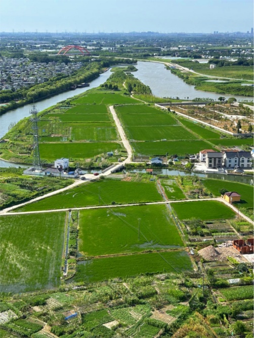 曙光单元位于赵屯社区南侧,西临西大盈港,面积9.61平方公里,涉及曙光、红旗等5个自然村。曙光沪派江南单元作为白鹤镇“林水相依”的特色风貌单元,水曲泾弯,塘泾蜿蜒,沿河横向带状分布,农田主要分布在以泾河分隔的圩田区域范围内,曲折纤细的水网和“一河、一埭、一片田”的村落格局呈现出“塘泾绕田,活水周流”的基因特征,书写了水、林、田、湿、村构成的江南纤网空间特色。