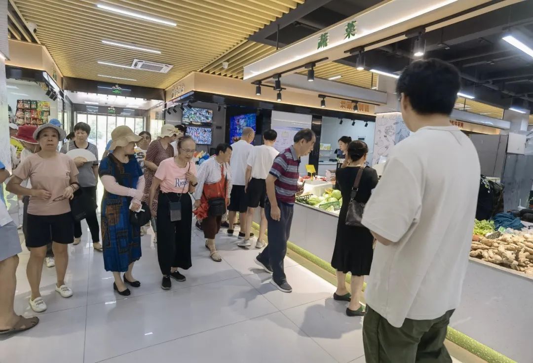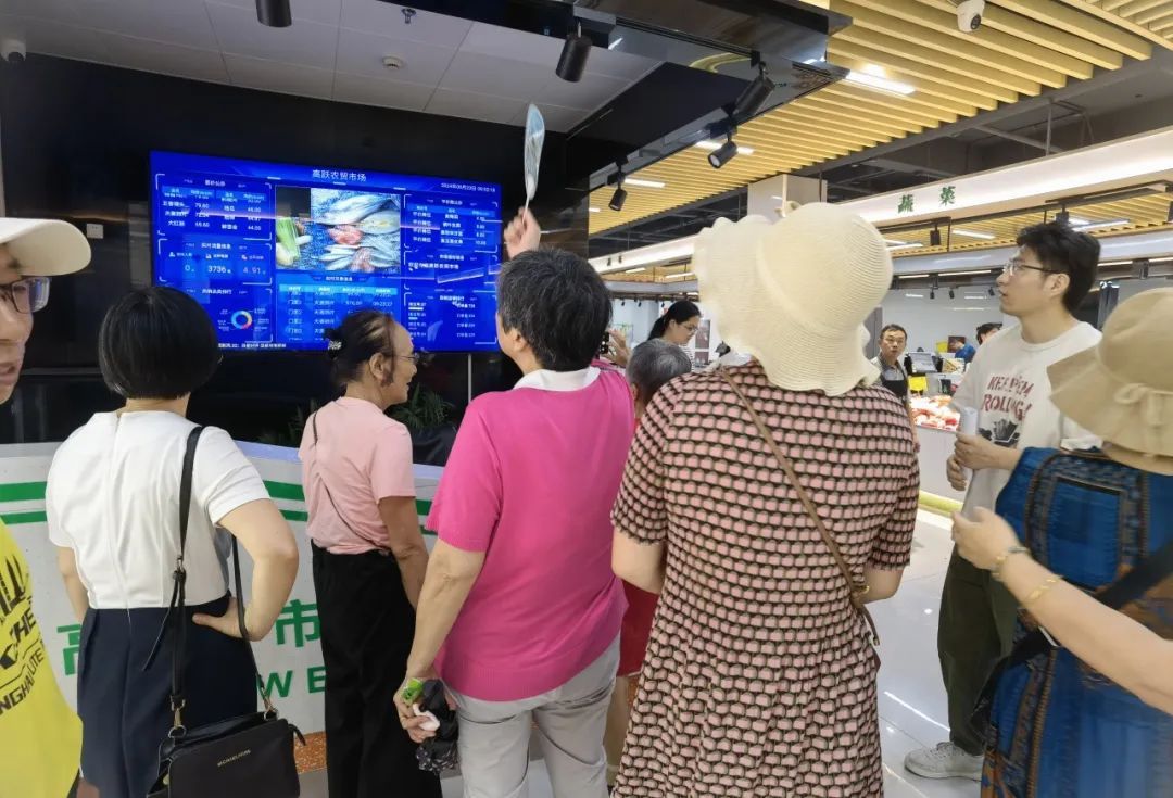 第一站,市民代表们来到了高跃路菜场。市场内的智慧管理系统立即吸引了市民代表们的注意。信息大屏、立式查询屏、智能监控、AI智能识别秤、智能农残快检仪等物联网设备,让市民代表们随时获取商品价格、产地信息、促销活动等相关信息,保障公开透明的消费环境。市场内配套便民维修、开锁配匙等便民功能,让市民代表们在享受市场智慧化改造带来的舒适、便捷的购物体验之外,还感受到浓厚的城市“烟火气”。