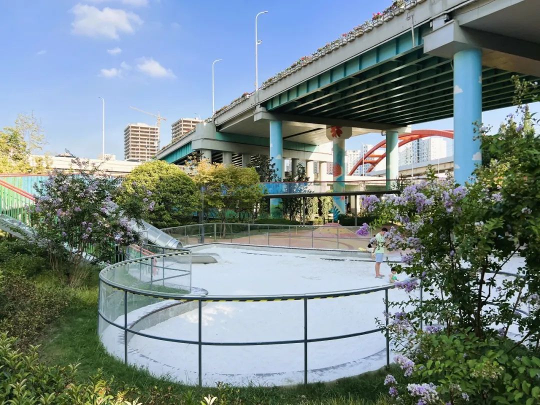 在体现“儿童友好”的设计理念时,区绿化市容局将安全性放在首要位置。比如,乐汇小游园沙坑座椅外,有一圈贴着警示带的透明挡板,沙坑边的小凸起,可以刮去鞋底细沙,降低孩子跌落的风险,地面则采用EPDM材质,与传统塑胶地面相比,弹性和柔软度更好,低龄活动区周边几乎看不到枸骨等带刺植物。