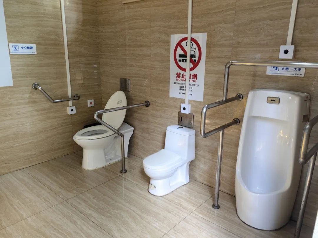 在公园绿地改造中,考虑适老适幼服务功能,设置第三卫生间,提高公厕人性化、精细化,配齐儿童专用如厕设施和洗手台;安装无障碍扶手,方便老年人起身和坐下;消除台阶高差,便于轮椅进出,让一老一小如厕更便捷。