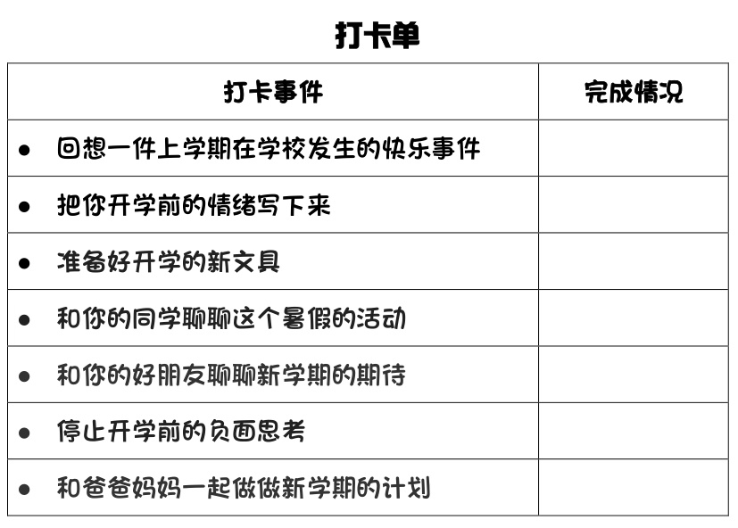 闵行区七宝镇明强小学的老师贴心地为学生们准备了开学打卡单。各位家长不妨参考,带着孩子一起完成以下小任务,调整好身心状态迎接新学期——