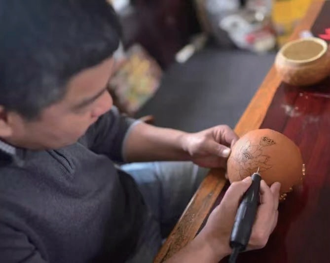 来到二楼的工作室,一进门,就感受到一股古朴的氛围,墙上挂着书法墨宝,窗边摆着一尊木雕的佛像,斑驳的质感透露出是个有些年代的物件,郭海洋说,“觉得好看,搬哪里都带着它”。博古架上摆满了形态各异的葫芦,或如天鹅、或如花瓶、或如鼻烟壶,还有个四方的物品,竟也是葫芦。茶桌上除了茶具,两个笔筒内插着各种葫芦加工的工具,刻刀、笔刷、电烙笔……
