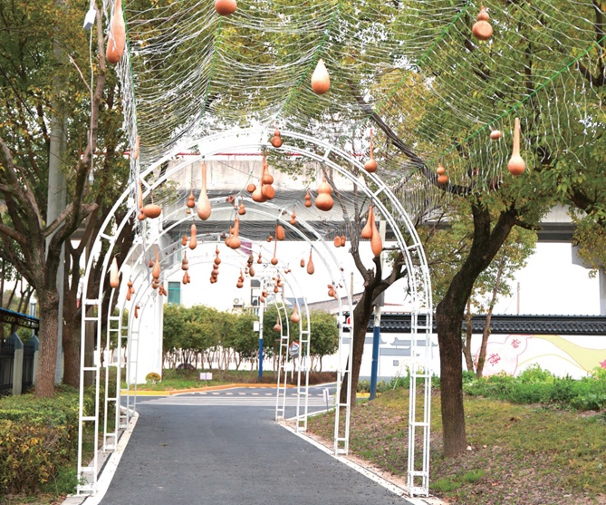 经过2023年美丽乡村的改造后,浦江镇汇东村闸航路上新式的现代建筑和传统的民居间杂交替,郭海洋的工作室就在这条路旁。一楼楼梯口就陈列着各种大葫芦,从地板到架子摆得井然有序,更有悬挂着的葫芦中国结。看我们前来参观,郭海洋热情地接待,从楼下开始,就不停地为我们介绍各种葫芦艺术品,并风趣地说,很多人不记得他本名,都叫他“郭葫芦”。的确,连他的手腕上都戴着由迷你小葫芦串成的手串。