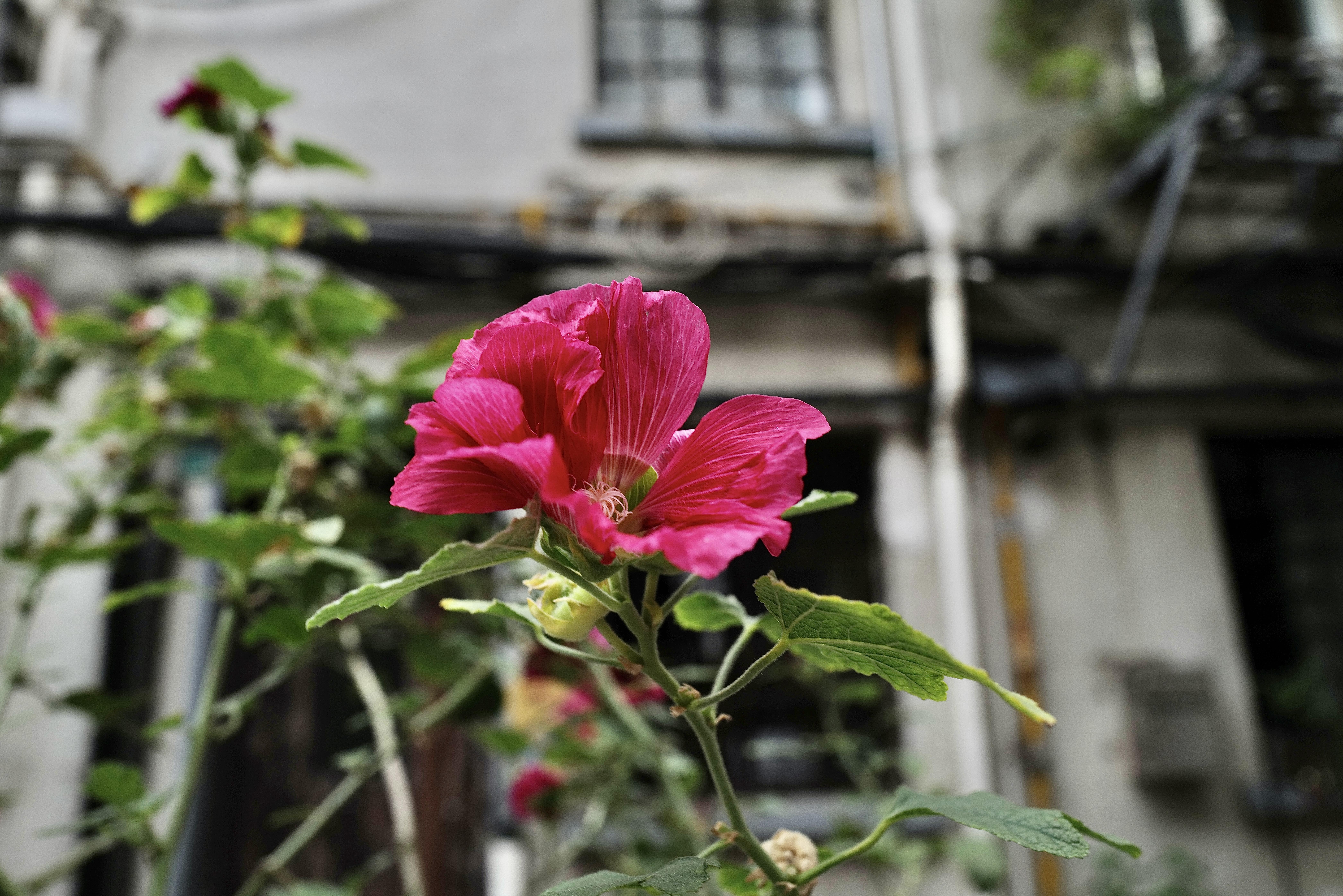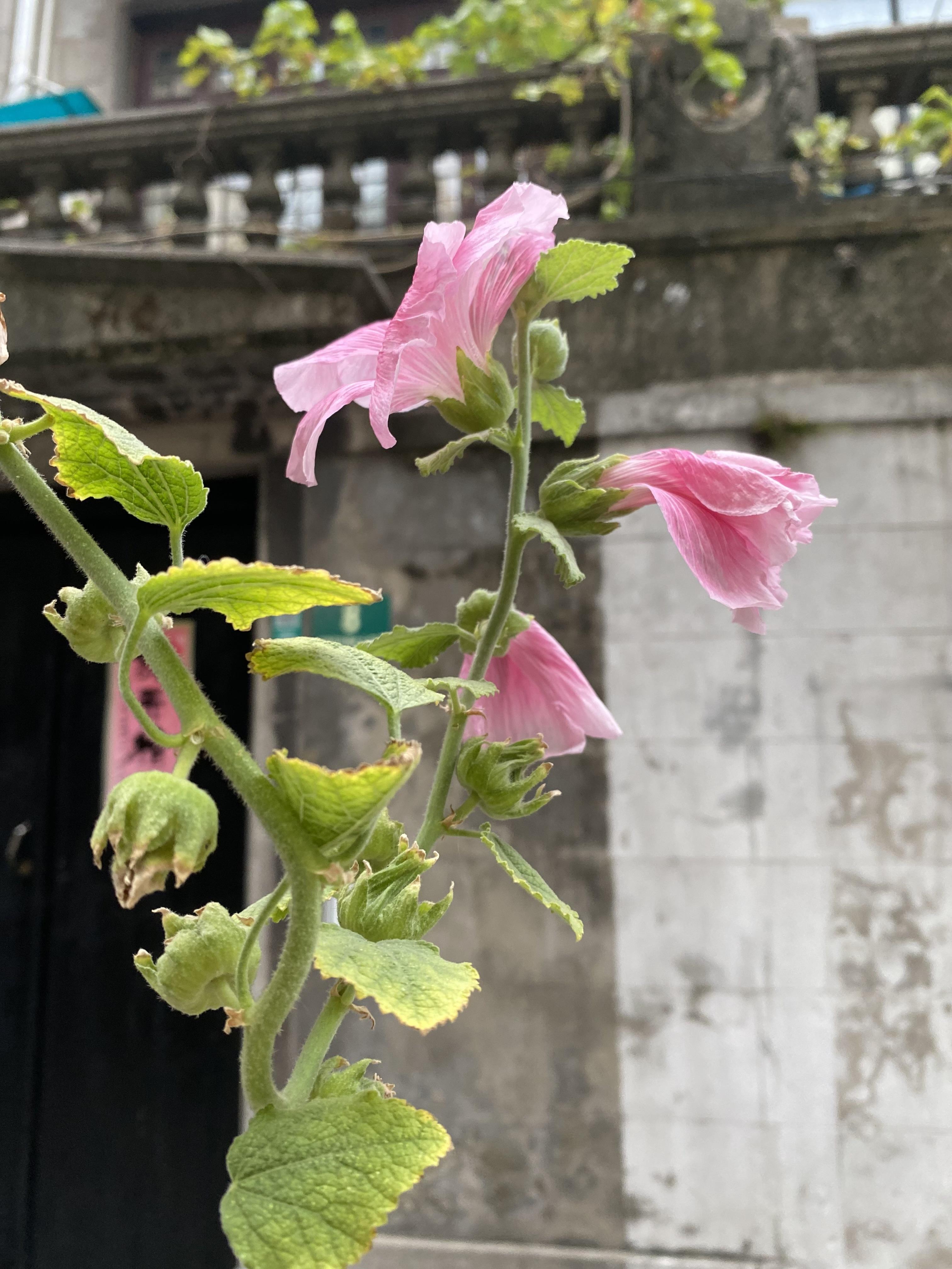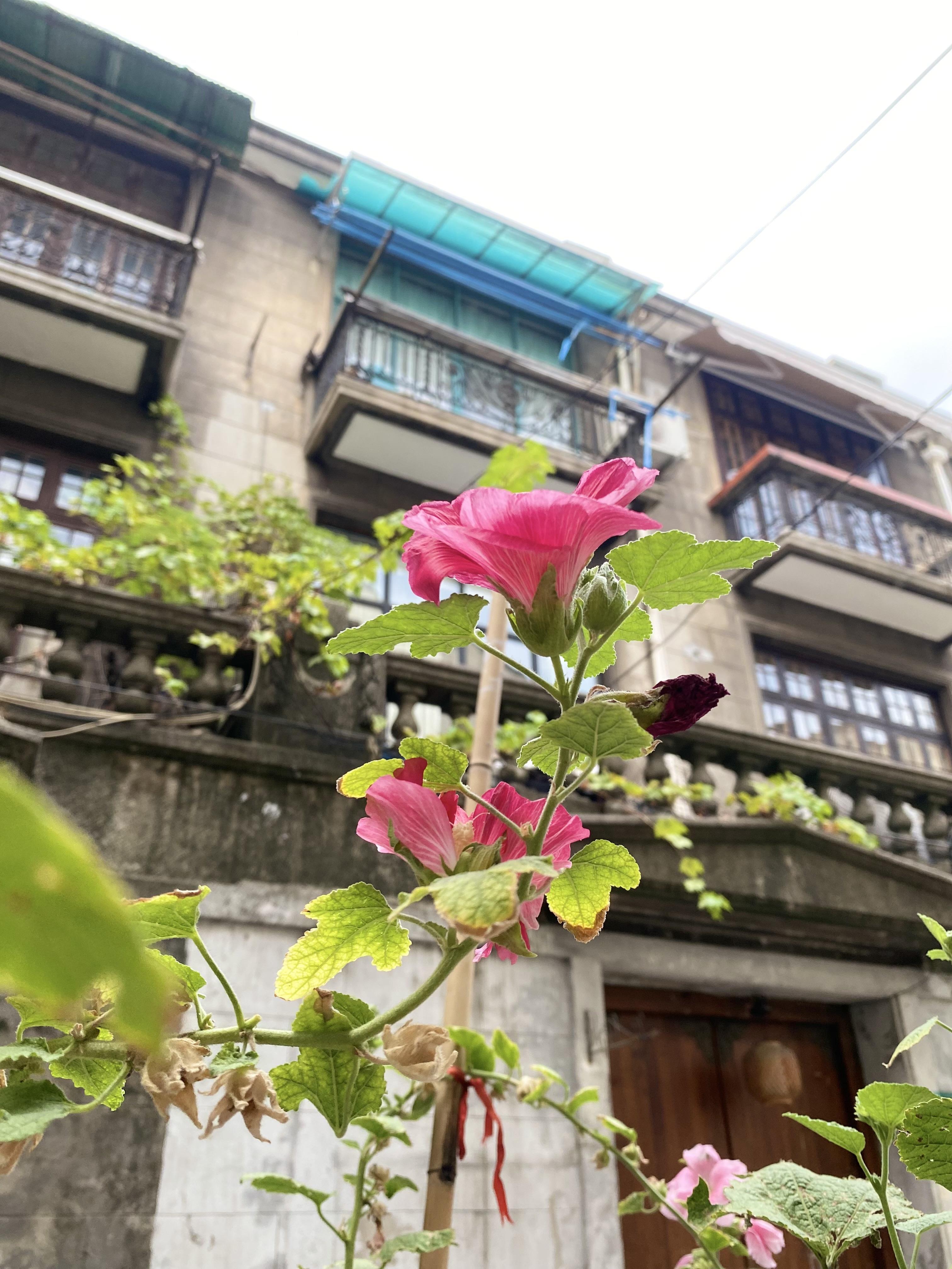 笔者路过老重庆中路的深巷之中,发现一户人家门口种植着一种高一米多的植物,绿叶衬着玫红色和淡粉色的大花。在高温下,它丝毫不受影响。花朵随风摇曳,特别好看。