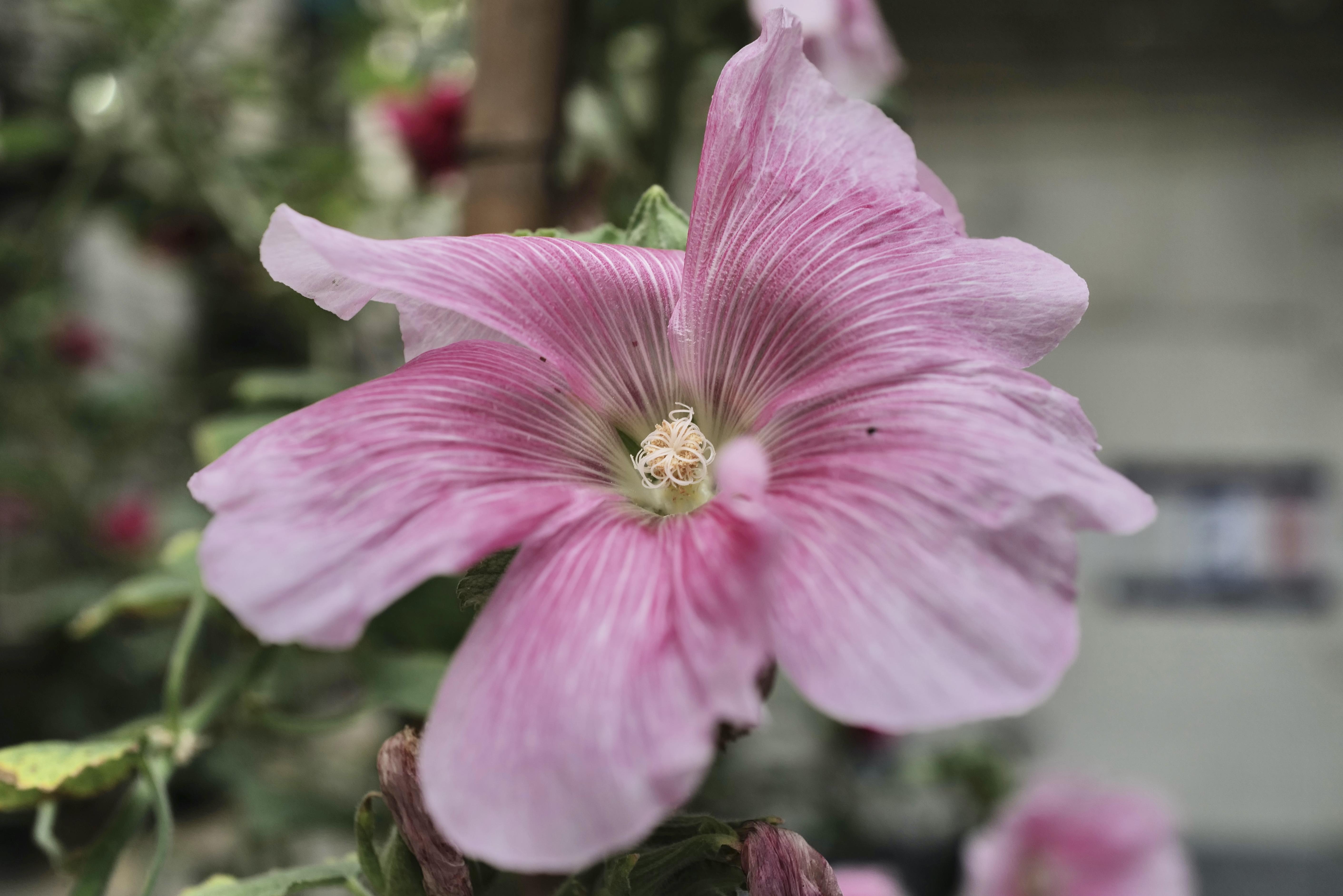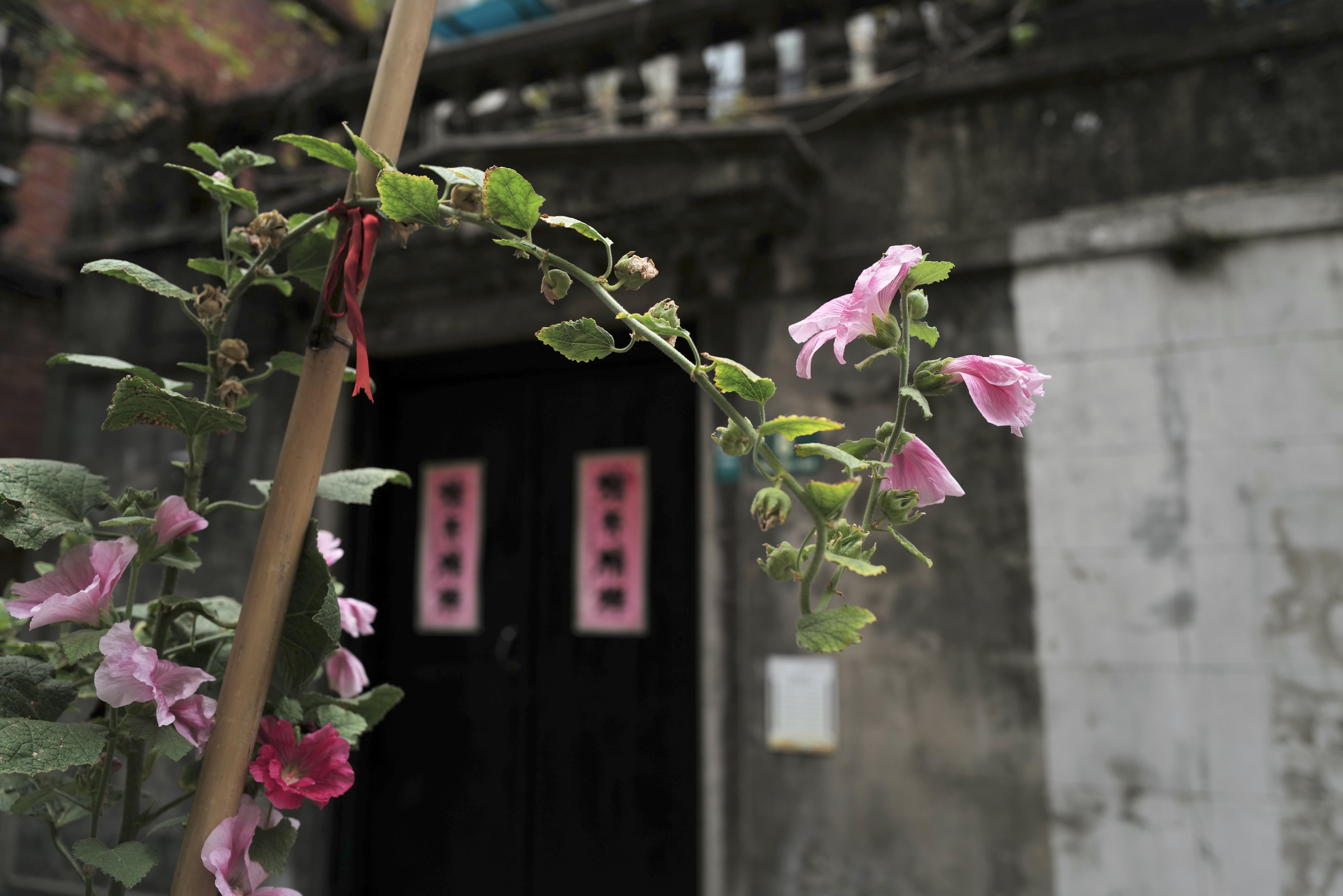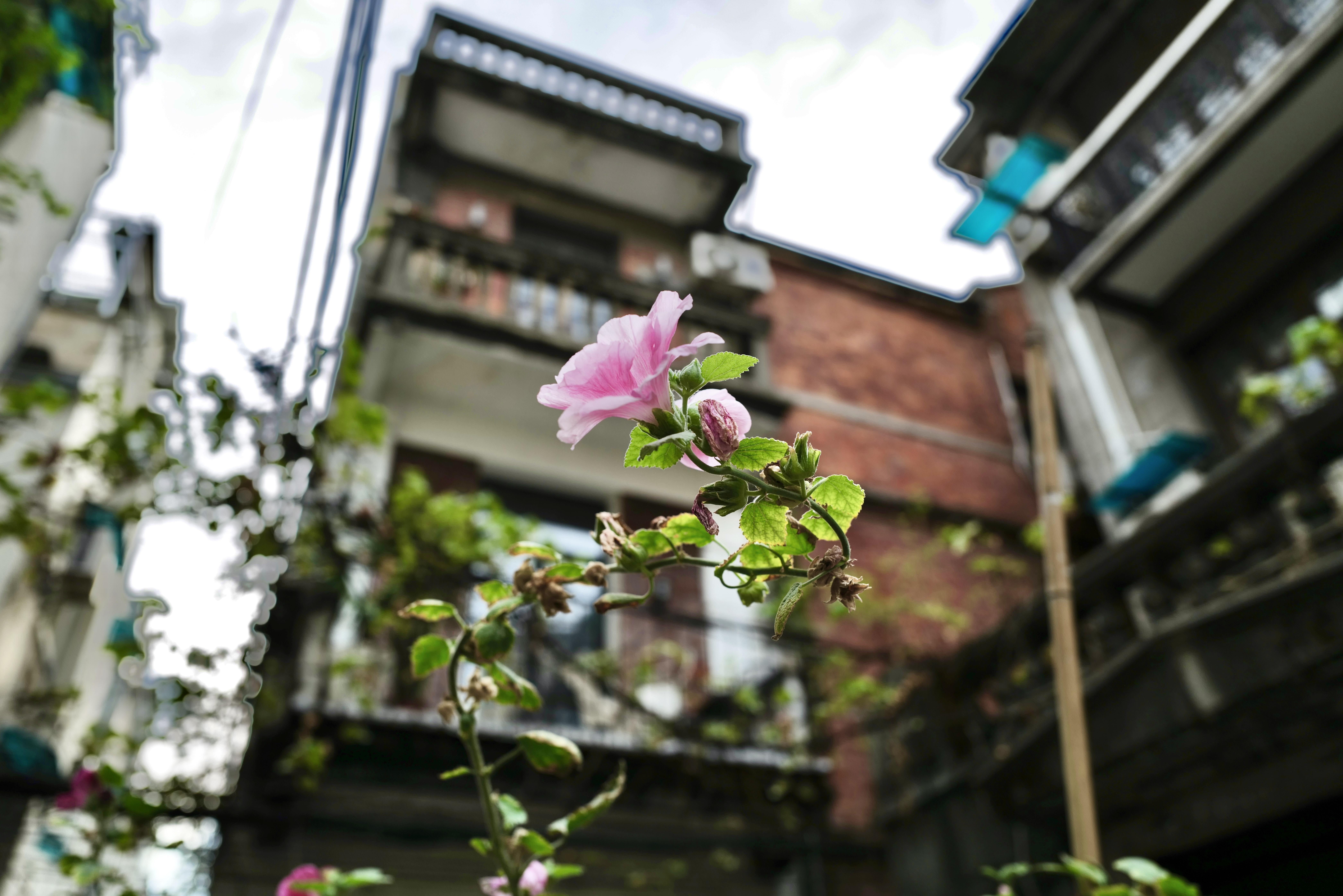 笔者路过老重庆中路的深巷之中,发现一户人家门口种植着一种高一米多的植物,绿叶衬着玫红色和淡粉色的大花。在高温下,它丝毫不受影响。花朵随风摇曳,特别好看。
