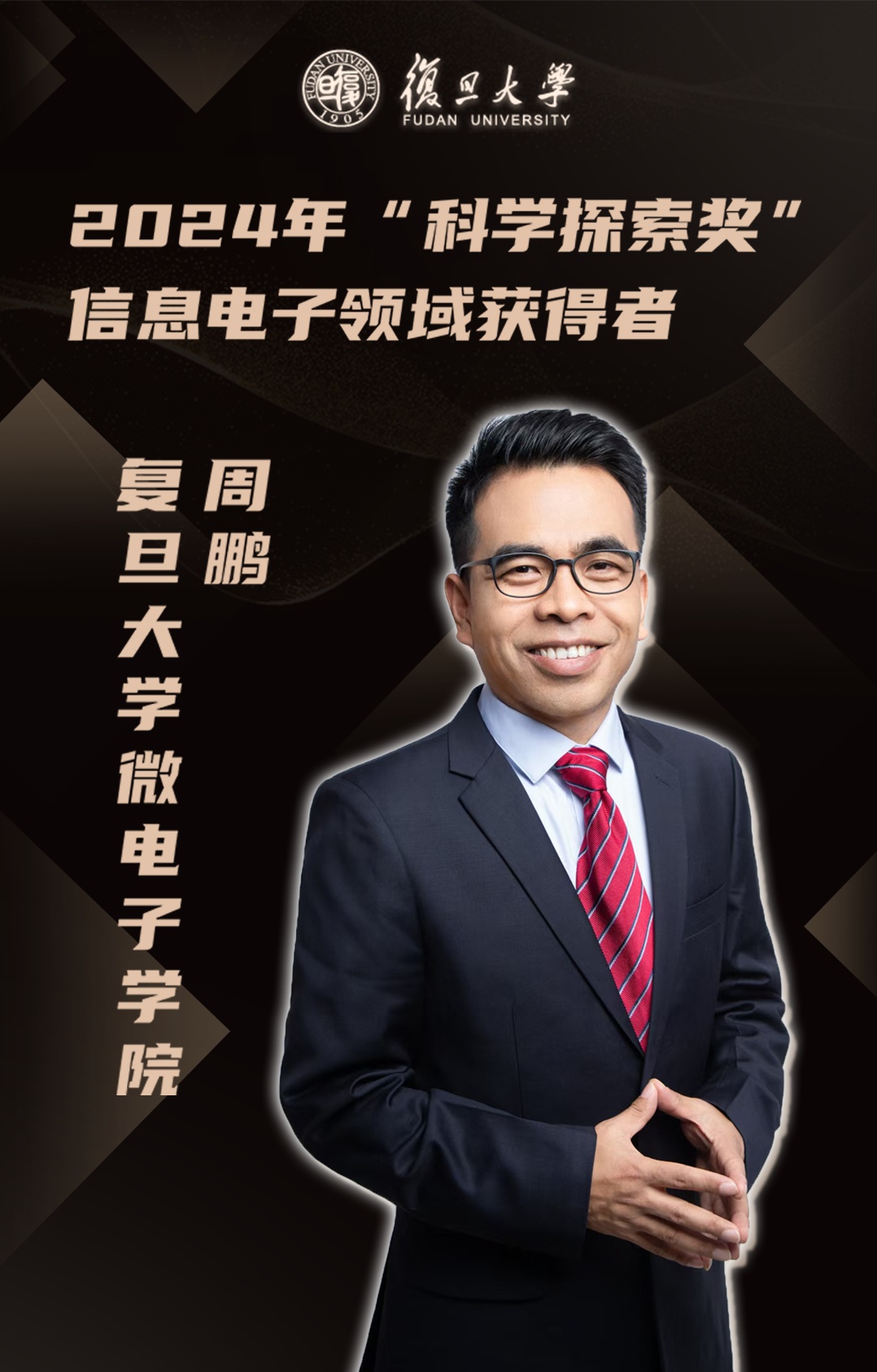 周鹏,分别于2000年、2005年获得了复旦大学物理学学士、博士学位。现为复旦大学集成电路与微纳电子创新学院人才培养中心主任。在研究中利用材料本源特性探索了双表面沟道、互补晶体管CFET,突破逻辑功能密度集成极限;探索存储器件性能边界,解决Flash超快非易失原理冲突难题。获得了国家自然基金委杰出青年资助,入选国家级领军人才计划。获国家级教学成果二等奖、上海市青年科技杰出贡献奖、教育部、上海市自然科学二等奖,IUMRS、NR45青年科学家奖等。