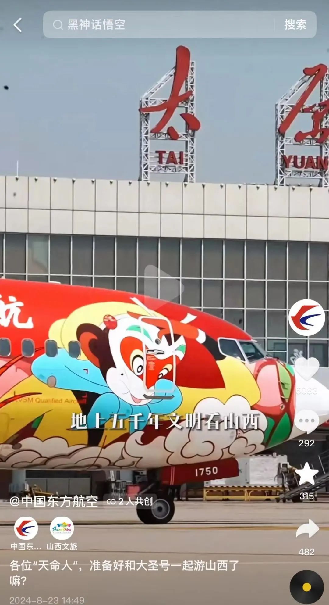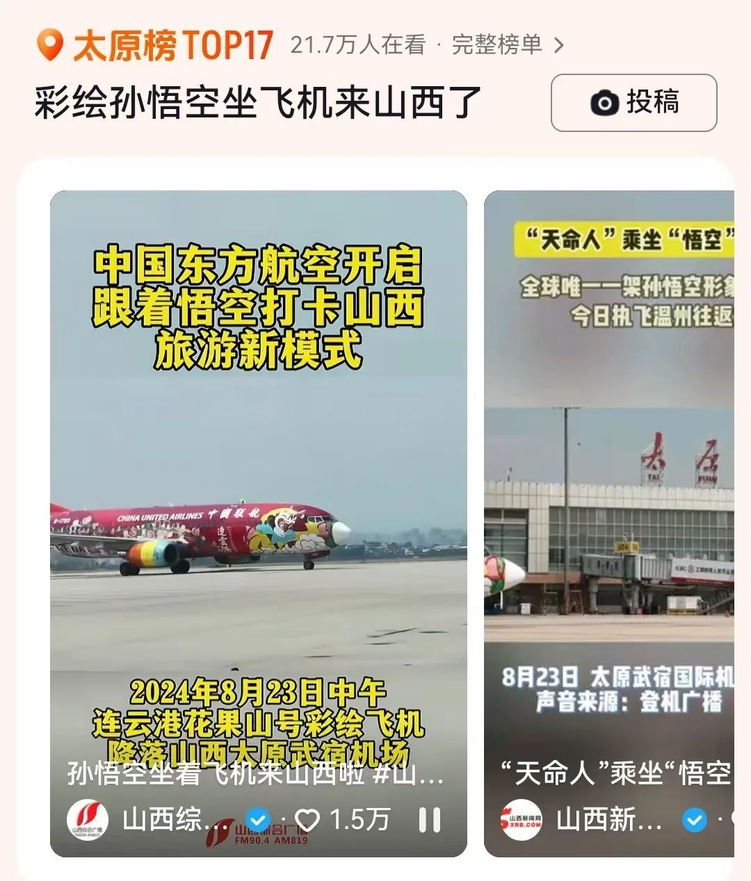 抖音、快手共发布9期内容,总播放量343万。其中“各位‘天命人’,准备好和大圣号一起游山西了嘛?”收获了大量关注、互动与点赞,视频登上抖音热搜榜。