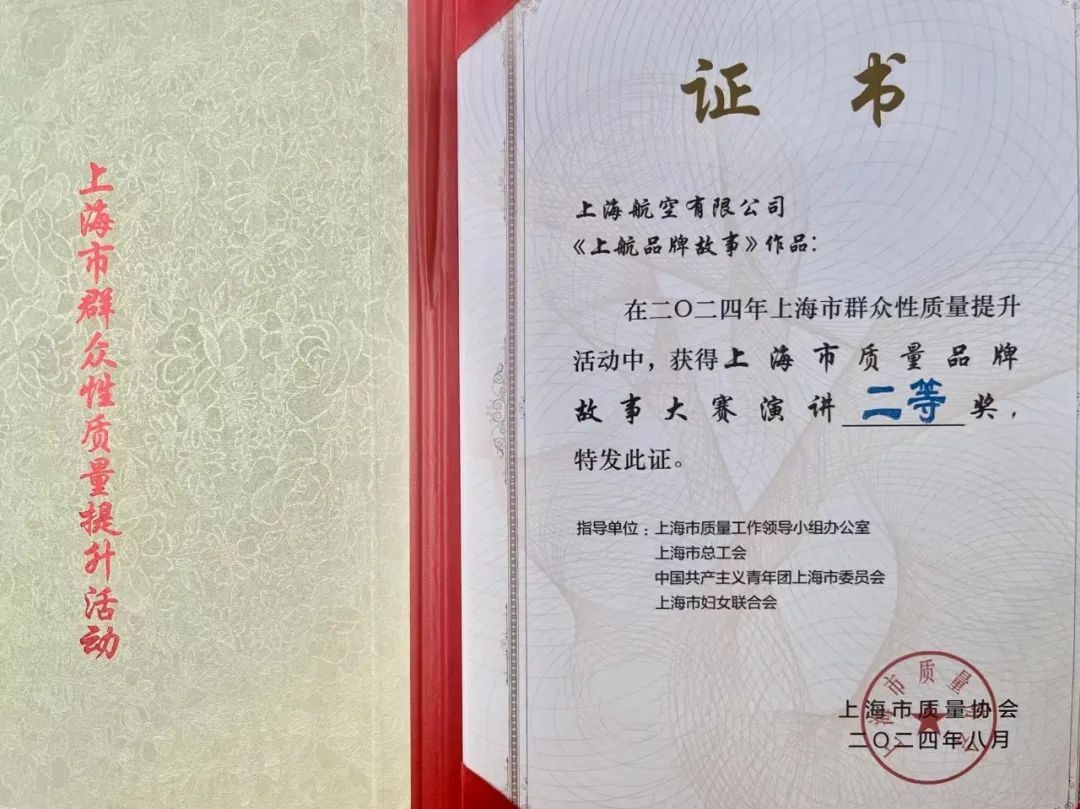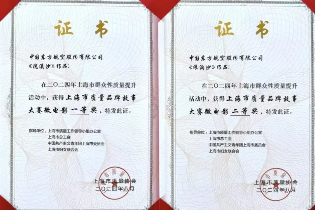 8月22日,由上海市质量协会主办的2024年上海市质量品牌故事大赛圆满落幕,大赛以“上海质量新优势中国品牌新风采”为主题,旨在宣传展示各行各业质量品牌建设最新成果及发挥品牌引领作用的经验和故事,传播质量品牌文化。东航凭借新媒体作品《浣溪沙》、《浪淘沙》分别荣获2024年上海市质量品牌故事大赛微电影一等奖、二等奖。同日,东航旗下上海航空的演讲作品《万米高空中的上海名片——上航品牌故事》获演讲类二等奖。