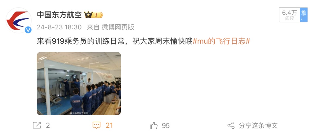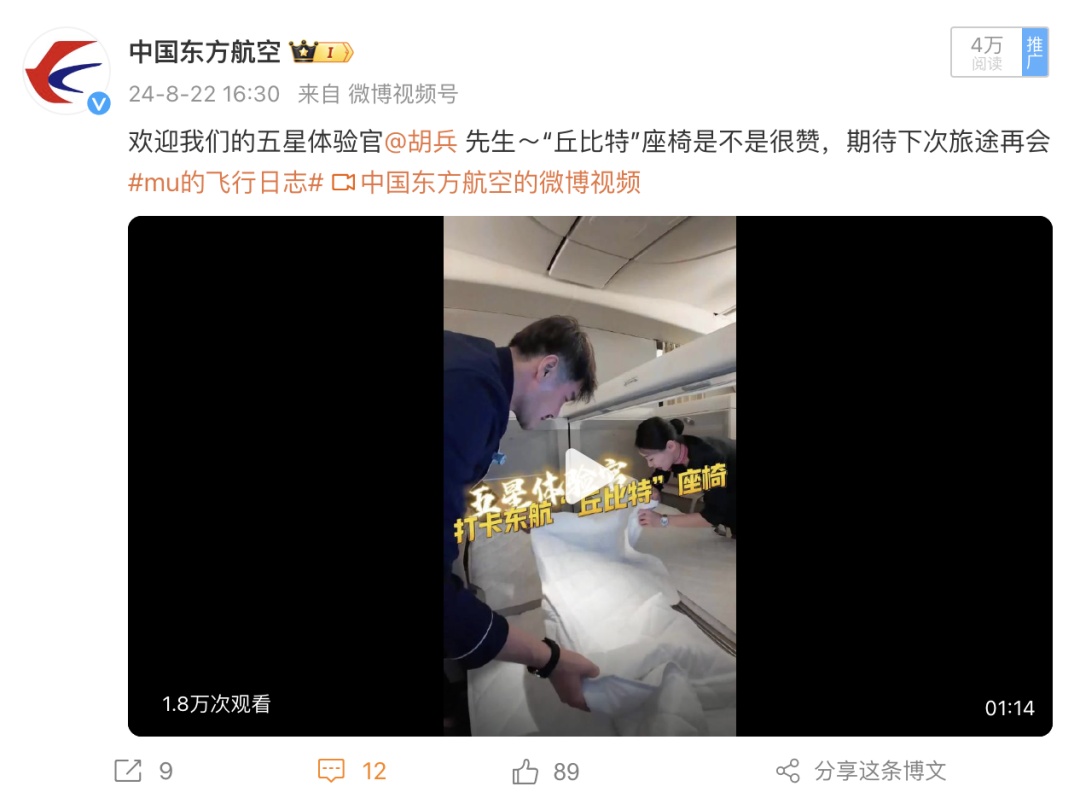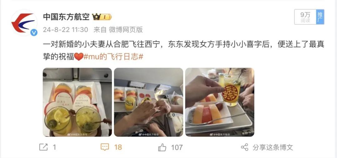 微博共发布22条内容,总流量110.9万。其中,“来看919乘务员的训练日常,祝大家周末愉快哦”、“一对新婚的小夫妻从合肥飞往西宁,东东发现女方手持小小喜字后,便送上了最真挚的祝福”、“欢迎我们的五星体验官@胡兵 先生~“丘比特”座椅是不是很赞,期待下次旅途再会”获得了更多的曝光量。