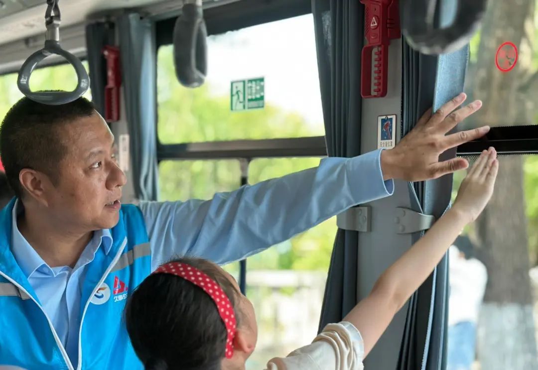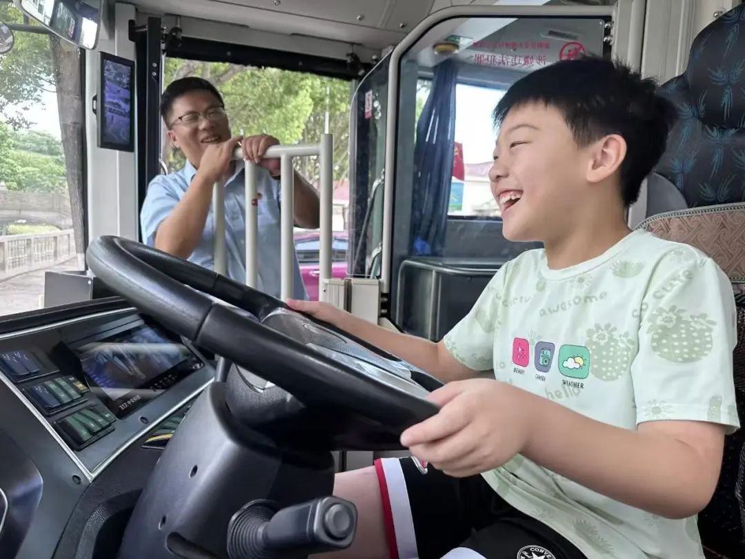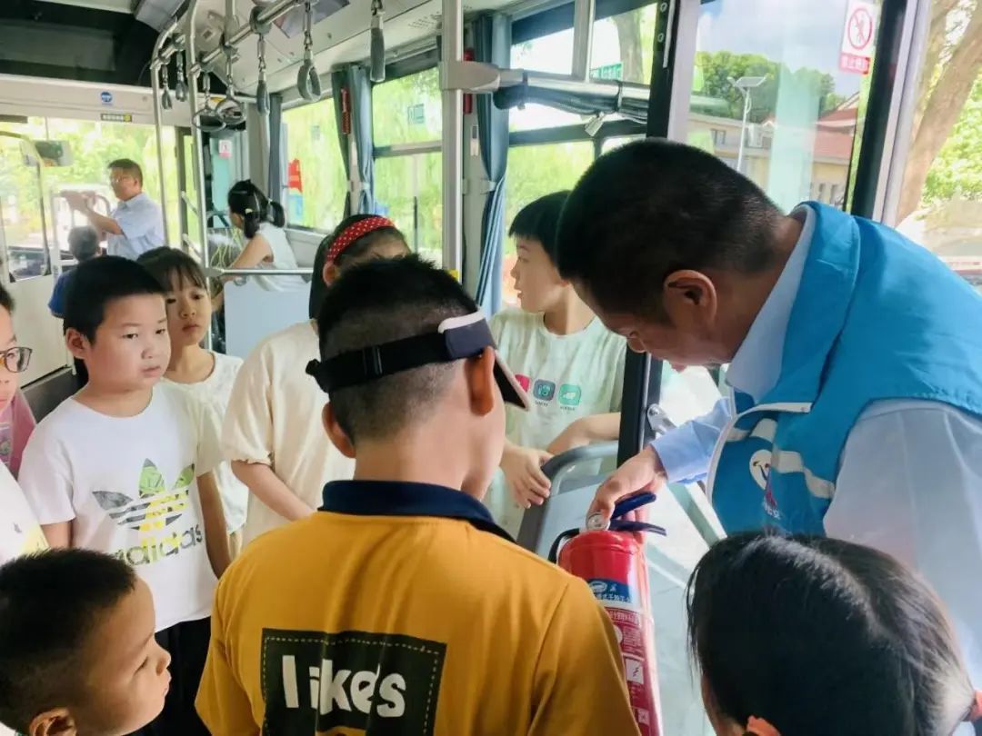 随后,在公交志愿者的带领下,孩子们有序地走进纯电动公交车车厢内,通过实地参观的形式进一步加深印象。在驾驶座椅上,充满好奇心的孩子们都体验了一把小小驾驶员的角色,亲身感受了公交车的视觉盲区。志愿者还向孩子们讲解了公交车厢内的灭火器、逃生锤等安全设施的位置、功能和注意事项,并示范了紧急情况下如何利用逃生窗、前后门安全应急开关等设施自救。