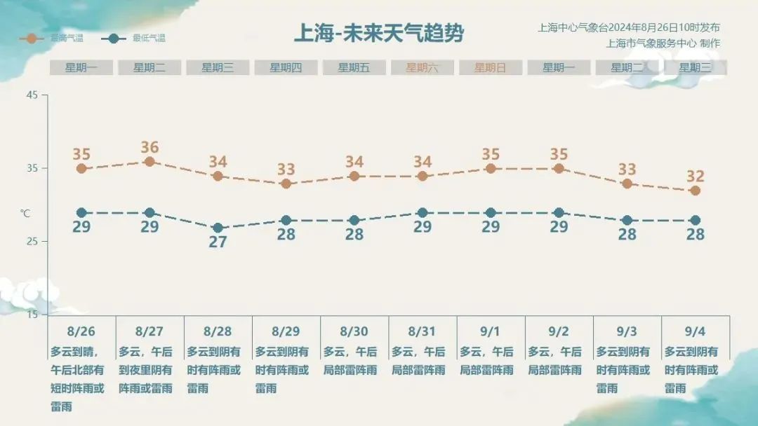 上海市气象局首席服务官邬锐告诉记者:“明天午后降雨会比较明显,局部地区将迎来阵雨或雷雨,雨量或达到大雨。明天还将维持高温,本周一头一尾虽然有高温,但周三到周六受雨水影响,以及副热带高压减弱,最高气温可能会回落到33~34℃,告别高温线。目前来看,9月初可能还会有高温,但总体来说在逐渐减弱,之后高温会越来越少。”
