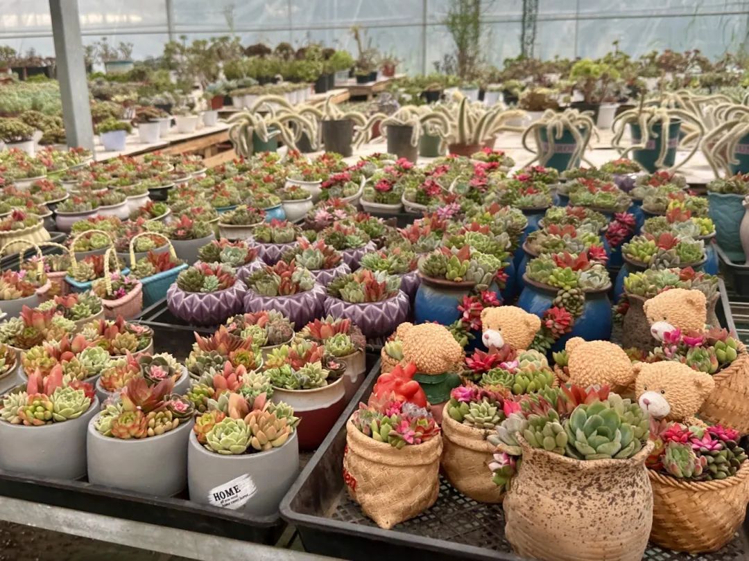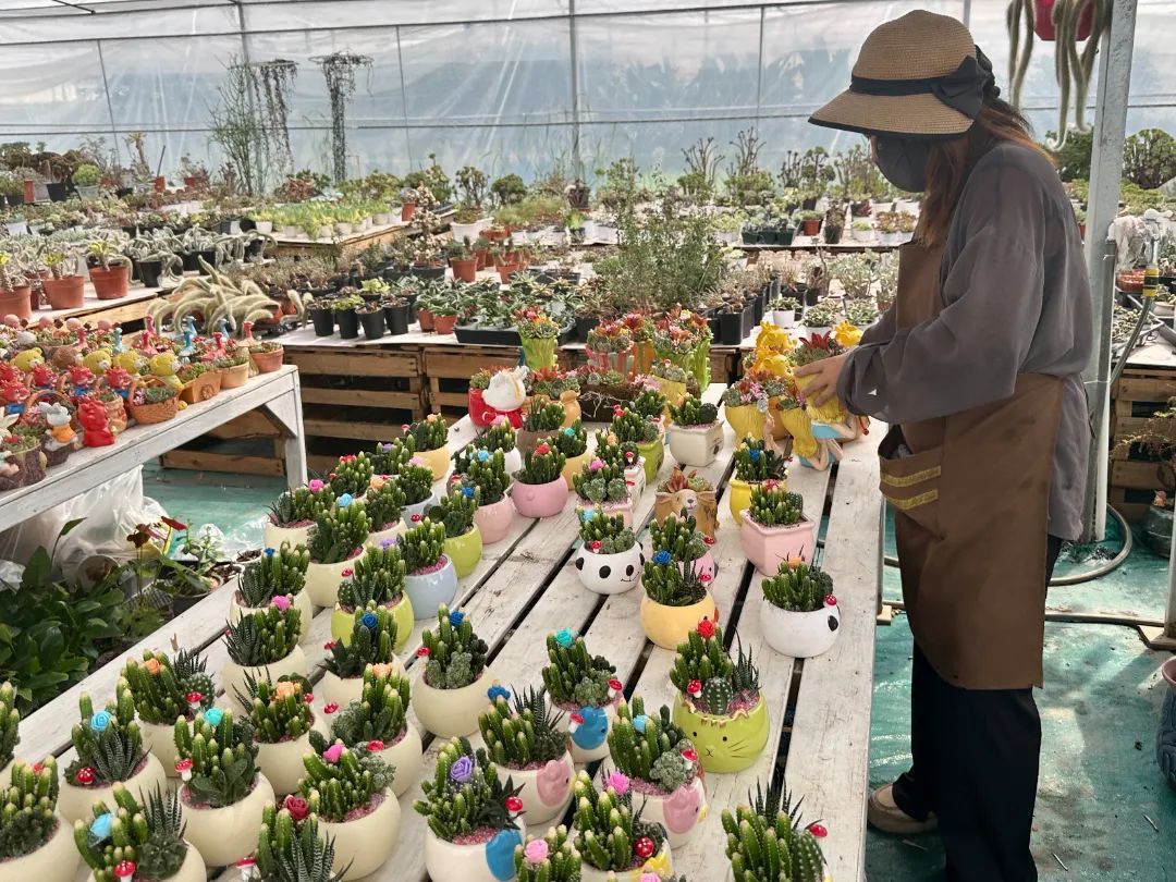 在主营多肉盆栽的香香多肉门店,五颜六色的多肉植物被摆满了货架,还有不少幼苗被盘铺在地上,供平湖来的花商批量选购。“最近天天加班到晚上12点,订单太多了。”负责人杨香香与记者交谈着,手里的动作一刻也未停下来,一边娴熟地盘点着新组装好的盆栽。据介绍,店里实现了从育苗、组盆到成品售卖的全环节生产,单盆售价约20元。“自产自销,价格自然优惠些,虽然忙,但很开心。”她笑言道。