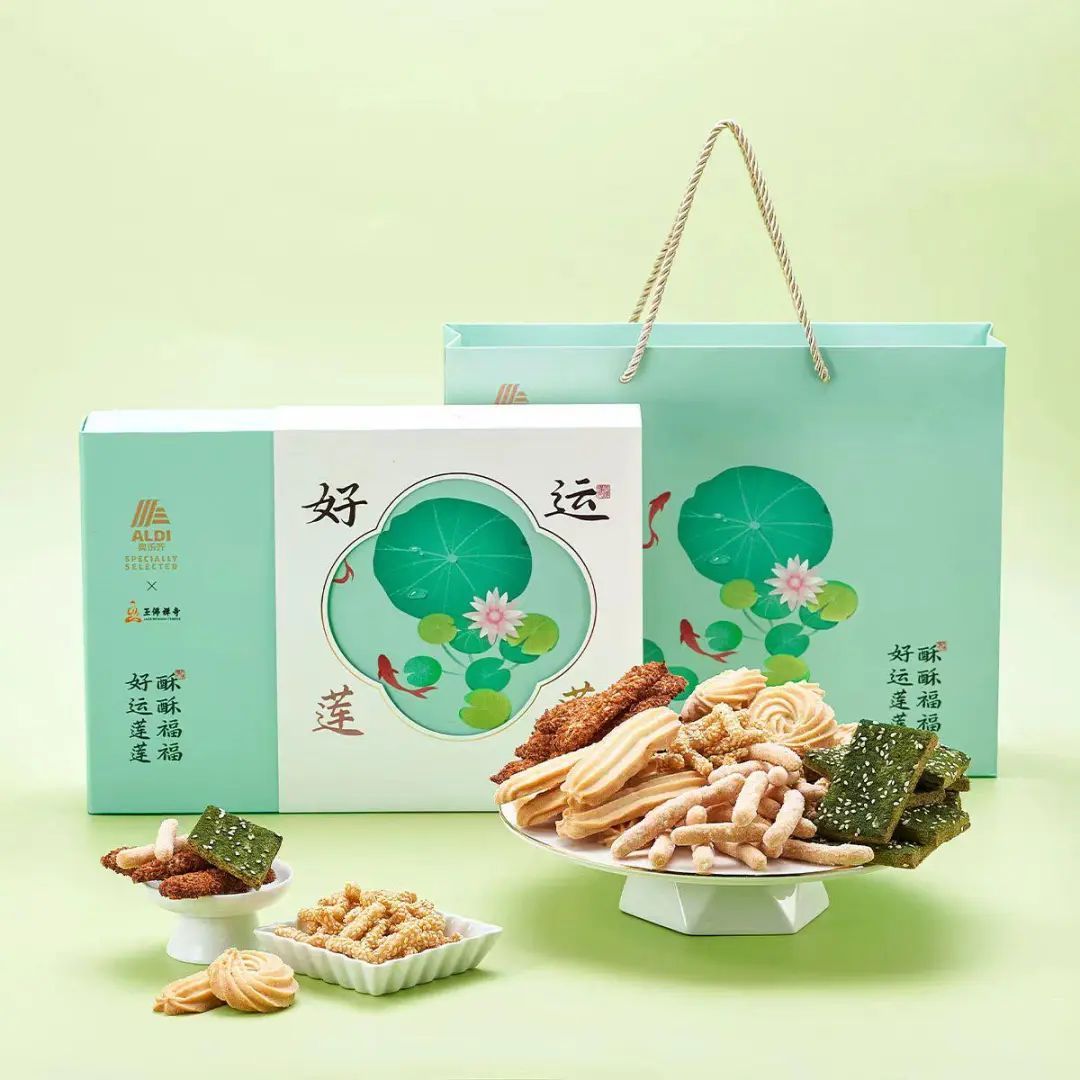 值得一提的是,这款联名礼盒在ALDI奥乐齐独家发售,即便是玉佛寺自身也并未销售。此外,奥乐齐还与玉佛寺推出了「奥乐齐×玉佛寺六合同风糕点礼盒」,内含6款净素糕点:甜淇淋、椰粒酥片、原味脆条、咸淇淋、苔条酥、油枣。