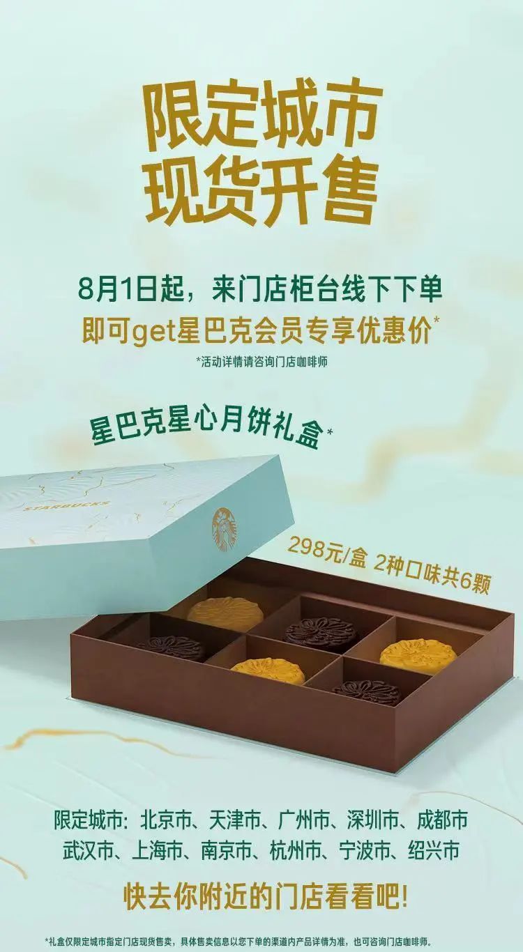早在8月初,星巴克就推出了新款港式月饼——星心月饼礼盒,包含2种口味共6颗,全国限定城市现货开售。其中,香滑奶黄月饼精选新西兰黄油和高品质咸蛋黄,蛋黄绵密、奶香细腻,咸甜交织;浓醇巧克力风味咖啡月饼,醇香可可邂逅星巴克咖啡,仿佛品味一杯摩卡咖啡。