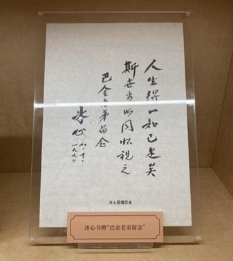 冰心曾在巴金画像旁题写赠言:“人生得一知己足矣,斯世当以同怀视之。”巴金则题:“冰心大姐的存在就是一种巨大的力量,她是一盏明灯,照亮我前面的道路,她比我更乐观。灯亮着,我放心地大步向前。”