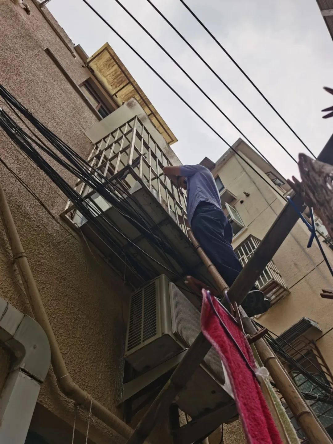 民警赶到现场,多次敲门仍无人应答,为了确认蔡老伯的安全,民警借来梯子攀至2楼,透过窗户发现蔡老伯躺在地上,情况危急。
