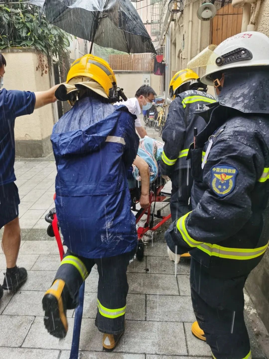 面对这一紧急情况,小贺再次拨打了119火警电话请求帮助。消防队员迅速赶到,他们清理出一条通道,确保救援工作顺利进行。在众人的合力下,蔡老伯被小心翼翼地抬至室外的担架上。