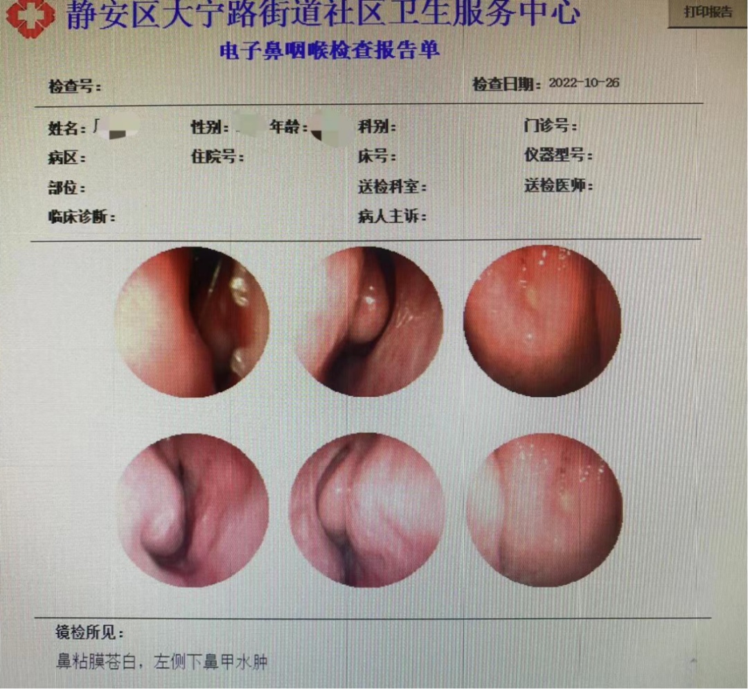 王阿姨长期鼻塞,一直未重视,近年来逐渐加重,为避免三级医院排队麻烦,至大宁路街道社区卫生服务中心过敏性鼻炎专病门诊就诊,鼻内镜检查结果显示为鼻息肉,周靖雯医生跟王阿姨讲解后征得同意,便通过医联体平台转诊至上海市中医医院耳鼻喉科就诊,优先安排住院手术治疗,经治疗王阿姨鼻塞明显改善,现已完全康复,王阿姨对就诊过程和治疗结果表示满意。