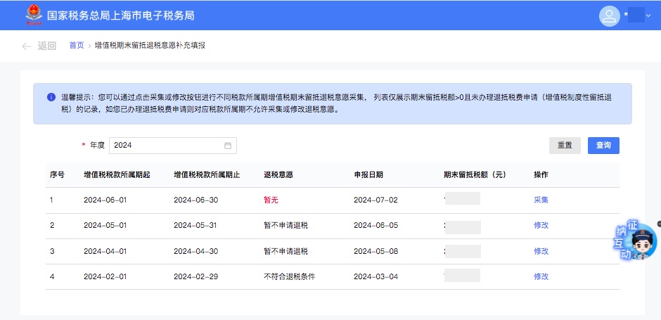 3.如果大家已经办理了退抵税申请(增值税制度性留抵退税),那么对应税款所属期是不允许采集或修改退税意愿的。