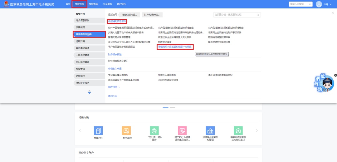 登录新电子税局后,大家可以点击【我要办税】-【税费申报及缴纳】-【申报辅助信息报告】-【增值税期末留抵退税意愿补充填报】,进入功能页面。