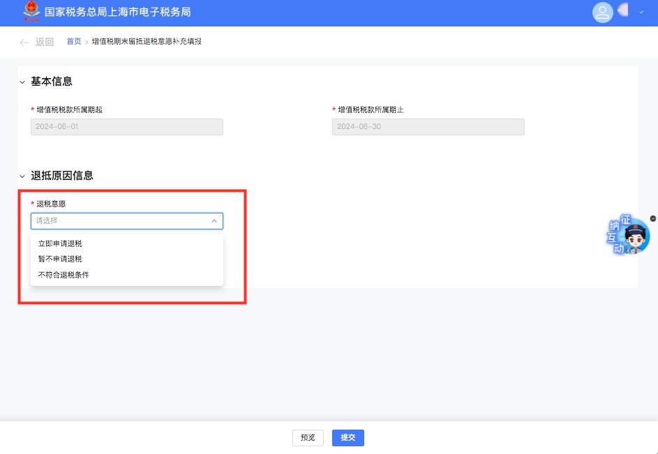 选择对应的增值税税款所属期后,大家可以根据实际情况选择退税意愿,分为"立即申请退税"、"暂不申请退税"及"不符合退税条件"。