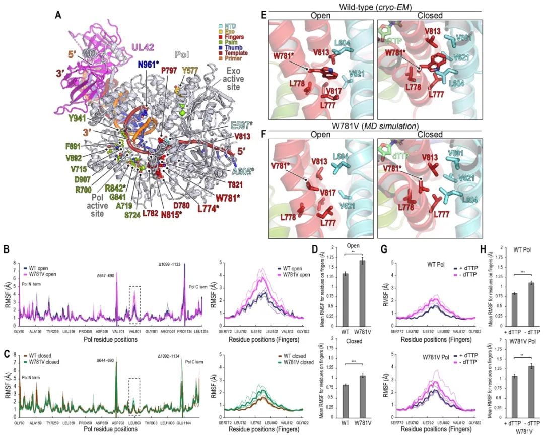DNA 聚合酶是一类重要的药物靶标,系列结构研究捕捉到了其构象的多样性。然而,对于聚合酶的动态构象对药物抗性的影响,仍是困扰人们的一大问题。核苷类似物阿昔洛韦、以及焦磷酸类似物膦甲酸钠靶向作用于单纯疱疹病毒(herpes simplex virus, HSV)聚合酶。对于这两种抗病毒药物,聚合酶(UL30或Pol)的催化亚基中多个位置的突变可以导致临床耐药。突变与耐药性的产生;阿昔洛韦以及膦甲酸钠对HSV Pol的选择性,目前二者机理均不明确。