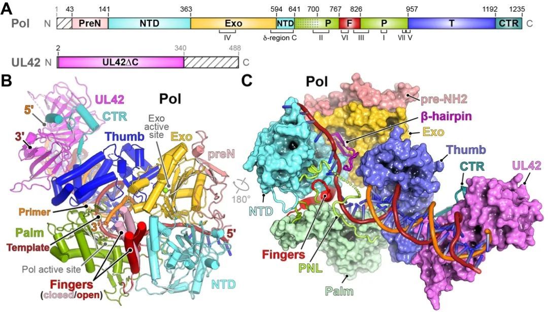 该研究首次揭示了多种构象下与DNA结合的单纯疱疹病毒聚合酶全酶(DNA-bound herpes simplex virus polymerase holoenzyme),以及其与临床使用的抗病毒药物的相互作用。HSV聚合酶是由Pol和一个促进长链DNA合成的过程性亚基(UL42)组成的异二聚体。HSV Pol具有典型的拇指、手掌和手指域,3'-5'外切酶域(Exo),以及NH2末端域(NTD),UL42作为单体紧密结合DNA。