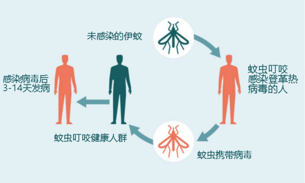 传播登革病毒的媒介主要为埃及伊蚊和白纹伊蚊,登革热通过“患者→伊蚊→其他人”的途径传播。