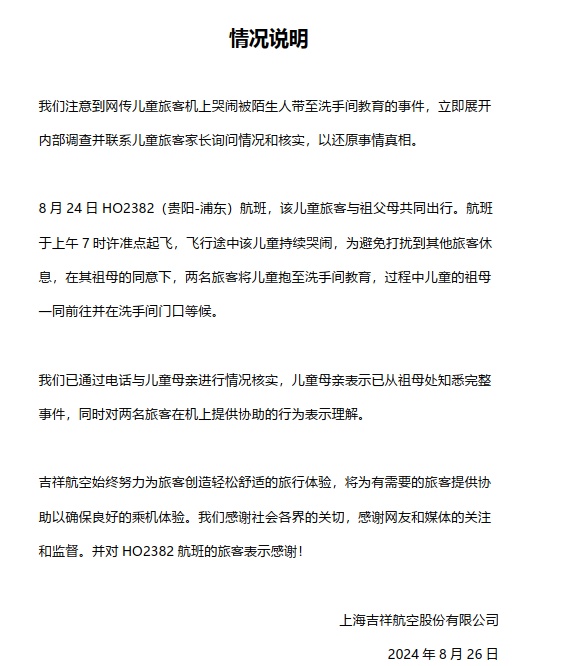 8月24日HO2382(贵阳-浦东)航班,该儿童旅客与祖父母共同出行。航班于上午7时许准点起飞,飞行途中该儿童持续哭闹,为避免打扰到其他旅客休息,在其祖母的同意下,两名旅客将儿童抱至洗手间教育,过程中儿童的祖母一同前往并在洗手间门口等候。