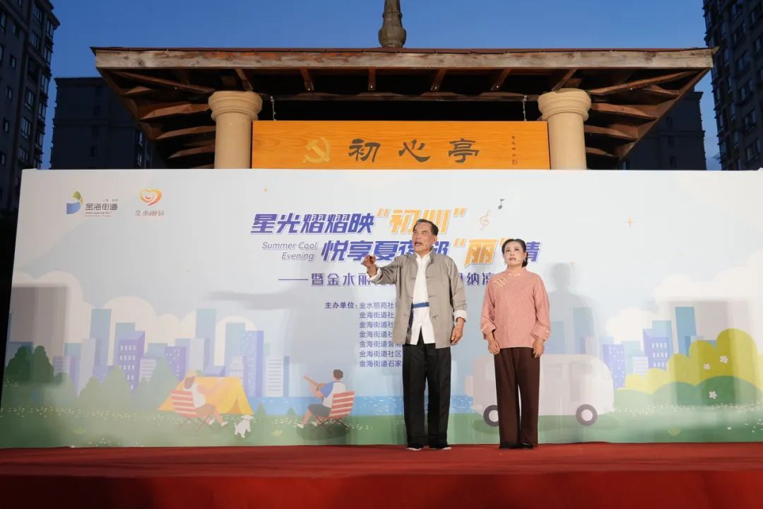 现场正在开展的,是第一届“初心舞台”夏日纳凉晚会。楼下板凳排排座,台上好戏轮番演,小区里的男女老少齐聚一堂,挥舞着小红旗,边看戏边乘凉。