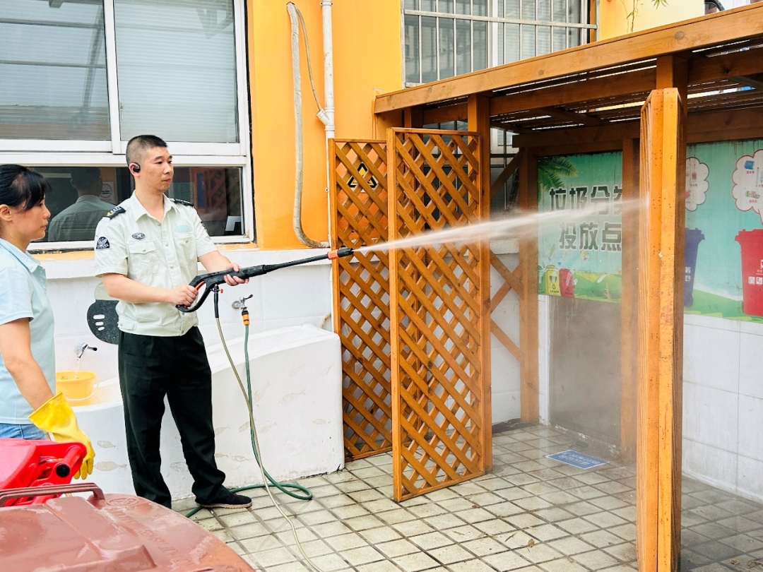 杨浦区市东幼儿园的保安与保育员联合行动,开展安全大检查:整理杂物,清理卫生死角;采用专业的高压水枪设备,对园内的垃圾箱与垃圾投放区域开展全面而深入的清洁作业,确保校园环境、公共空间整洁舒适。