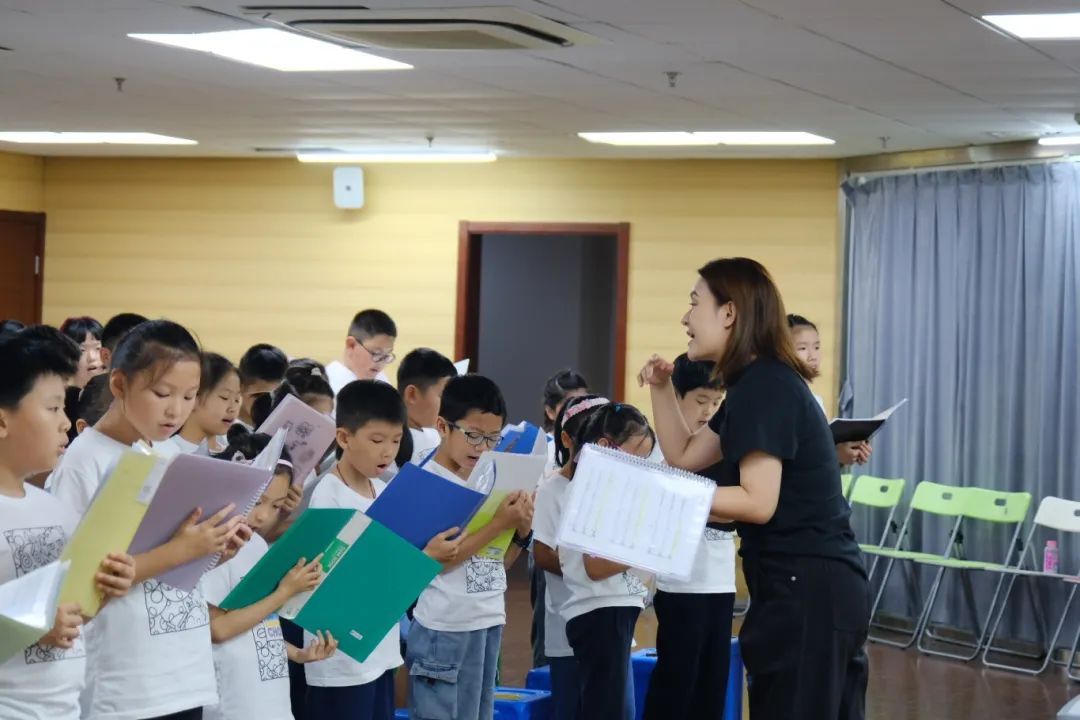 “身体放松,嘴巴要张开,用腹部的力量提高音量。”“男生的声音再大一点点。”……闵行童声合唱团的音乐指挥老师申佳立时不时地将双手跟着音乐的节奏扬起,全神贯注地注视每一个孩子,用她独特的音乐指挥技巧和音乐的感知力捕捉着合唱团中每一个细微的声音变化。乐理基础、视唱练耳、体态律动、表演能力训练等课程内容让短期的合唱集训丰富而充实,“合唱音乐无疑是培养孩子们具有团队协作,理解和谐的一种简易与合适的方式。我们因材施教,保证孩子们在合唱学习道路上都能找到自己的节奏,一课一得,一步一脚印,实现阶段式成长。”申佳立介绍说。“我喜欢唱歌,来这个合唱团8年了,每次演出和比赛我都觉得收获挺大的,可以和老师学到很多唱歌的知识技巧,在这里特别放松和快乐!”合唱团成员林子彧在合唱团里是最活泼也是最积极的一位,唱歌对她来说是一件能让她感到开心的事情,即使每天课后甚至周末过来排练,她都乐在其中。