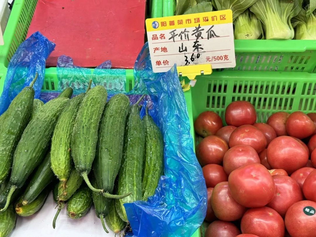 黄瓜每斤3.6元,西红柿每斤4元,土豆单价1.7元......。在阳普国和菜市场,平价菜专柜前不少蔬菜都举着平价菜的价签,等候着大家挑选。相比于普通的蔬菜摊位,这里的蔬菜价格基本能打上七折,有的甚至是普通菜摊的五折。