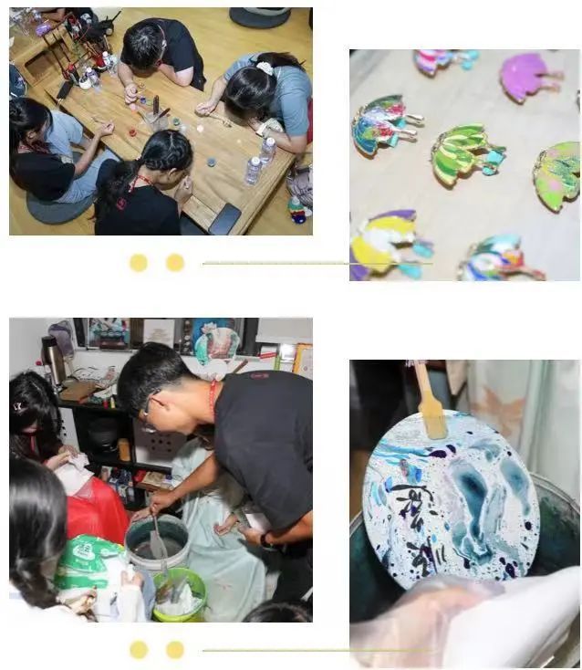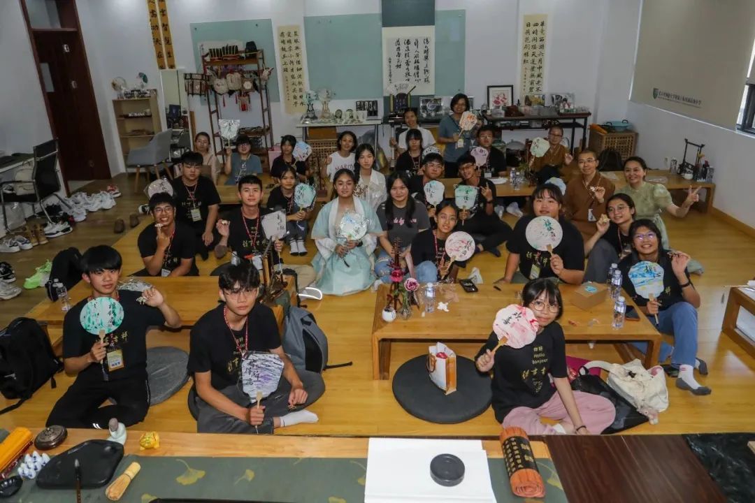 品茶结束后,台湾青年来到北外田园高级中学,在校长陆振权的带领下,参观了学校文创大楼的十大工作坊。在国学礼仪工作坊,台湾青年还体验了点蓝技法以及漆扇制作。青年们热情高涨地投入到实际操作中,将釉料依次填入蝴蝶胸针框架中,体验这门古老技艺的精妙之处。尽管制作过程繁琐,但大家表现出了极大的耐心,最终完成了一件件独具匠心的作品。