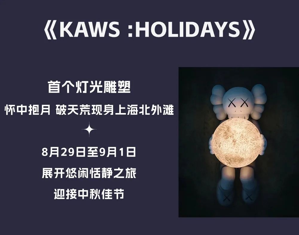 著名艺术家KAWS和其长期合作伙伴 AllRightsReserved将在北外滩国客中心码头,特别呈献其标志性角色COMPANION的全新造型,一个悠闲静卧、怀中抱月、仰望天空的大型充气装置艺术品。适逢中秋佳节将至,作品借由这个具有千年历史的传统节日,展开一趟艺术文化之旅。