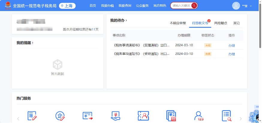 新电子税局将功能菜单挪至页面最上方,划分为【首页】、【我要办税】、【我要查询】、【公众服务】和【地方特色】五个板块。后面四个模块中均涉及出口退税事项。对于上海保留的原电子税局的地方特色功能,保留在【地方特色】专区中。