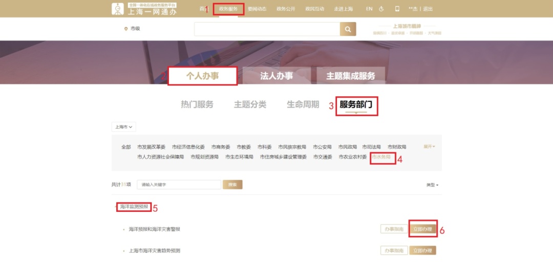 在“上海一网通办”搜索“海洋预报和海洋灾害警报”,点击“立即办理”即可查看。