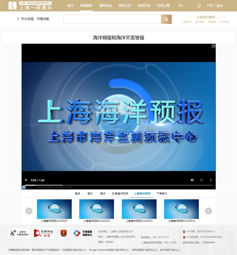 此次上线“一网通办”的“上海海洋预报”视频产品是在“海洋预报和海洋灾害警报”“上海市海洋灾害趋势预测”“上海市海洋监测分析月报”三项公共服务事项基础上的拓展和创新,将更好服务社会公众涉海活动需求,为海洋防灾减灾和上海现代海洋城市建设提供更加有力的保障。