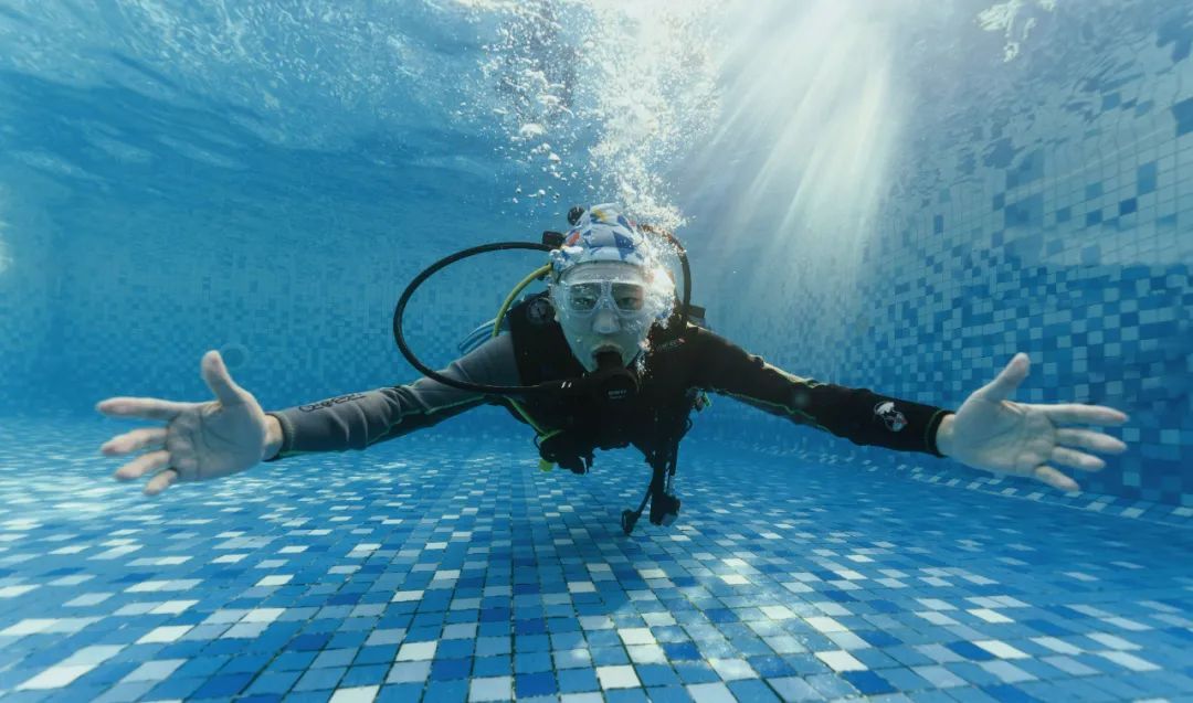 “好的,再检查一下你们的面镜、调节器、浮力控制装置,我们准备下水。”8月27日,记者来到位于上海东方佘山翰悦阁酒店的Let’Ski滑雪趣·PADI潜水中心,PADI注册潜水教练陈荪玮正带领学员进行平静水域的潜水练习。