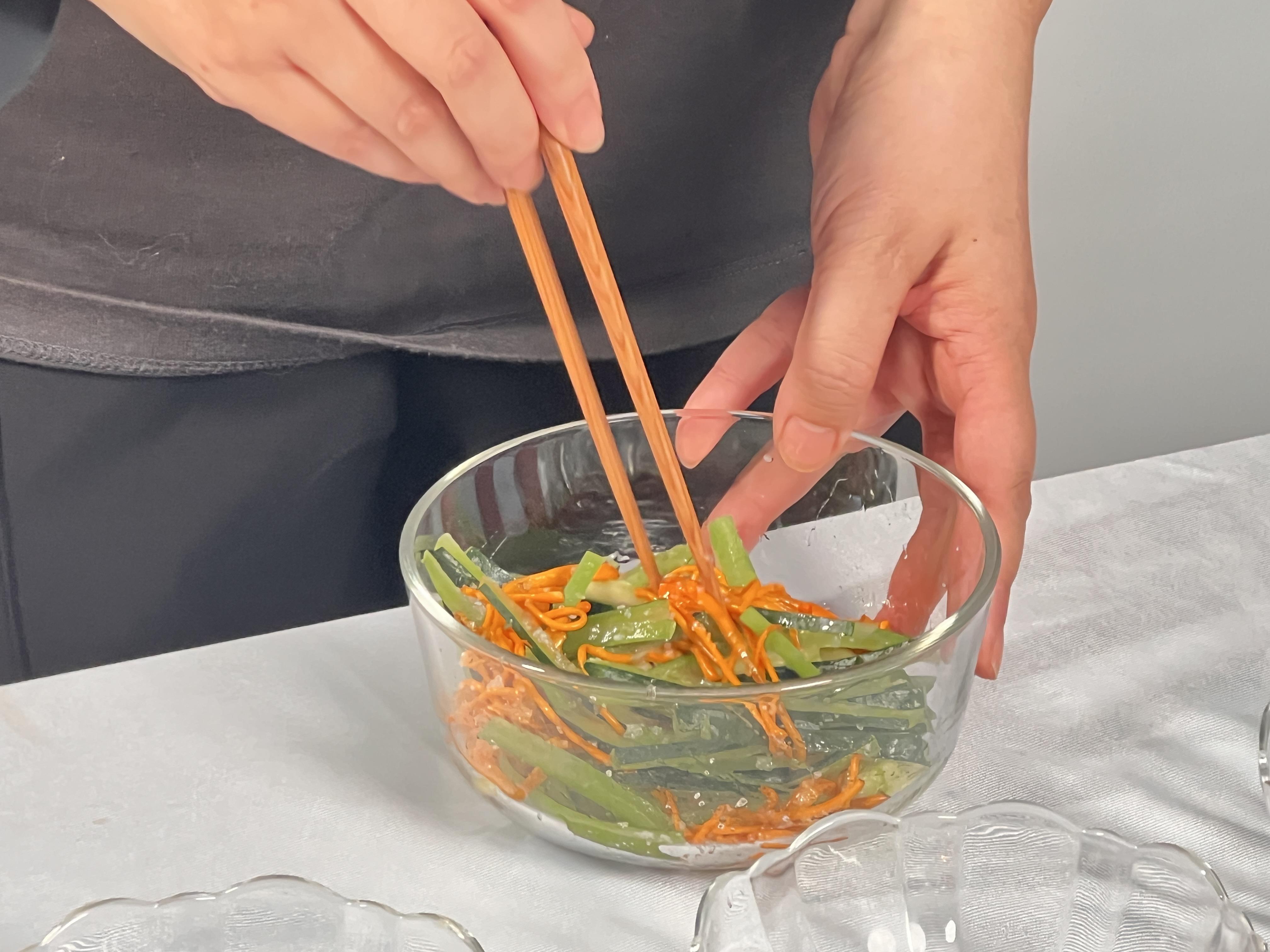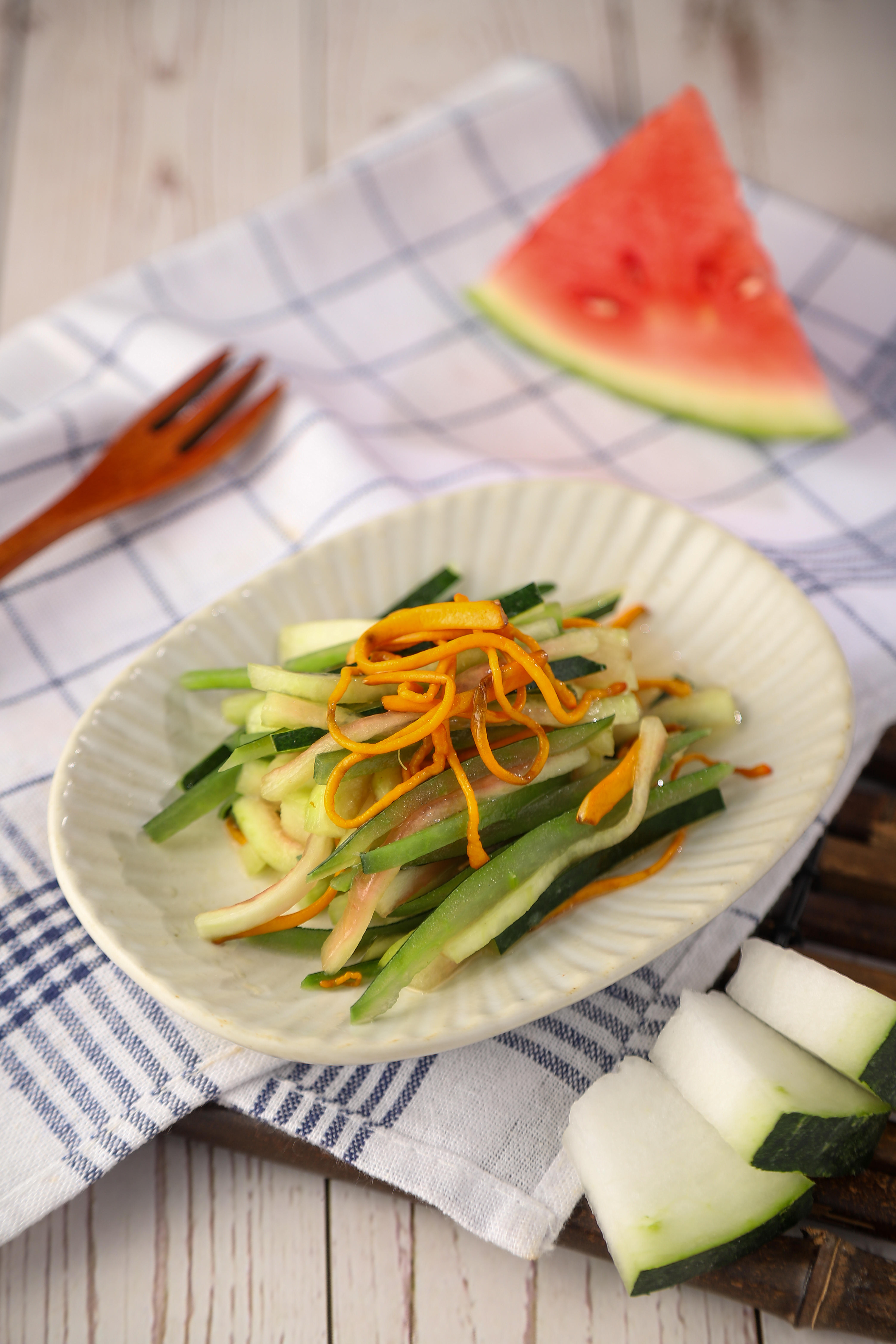4.将冬瓜皮西瓜皮虫草花倒入碗中,加入适量糖、盐,香油,搅拌均匀即可。