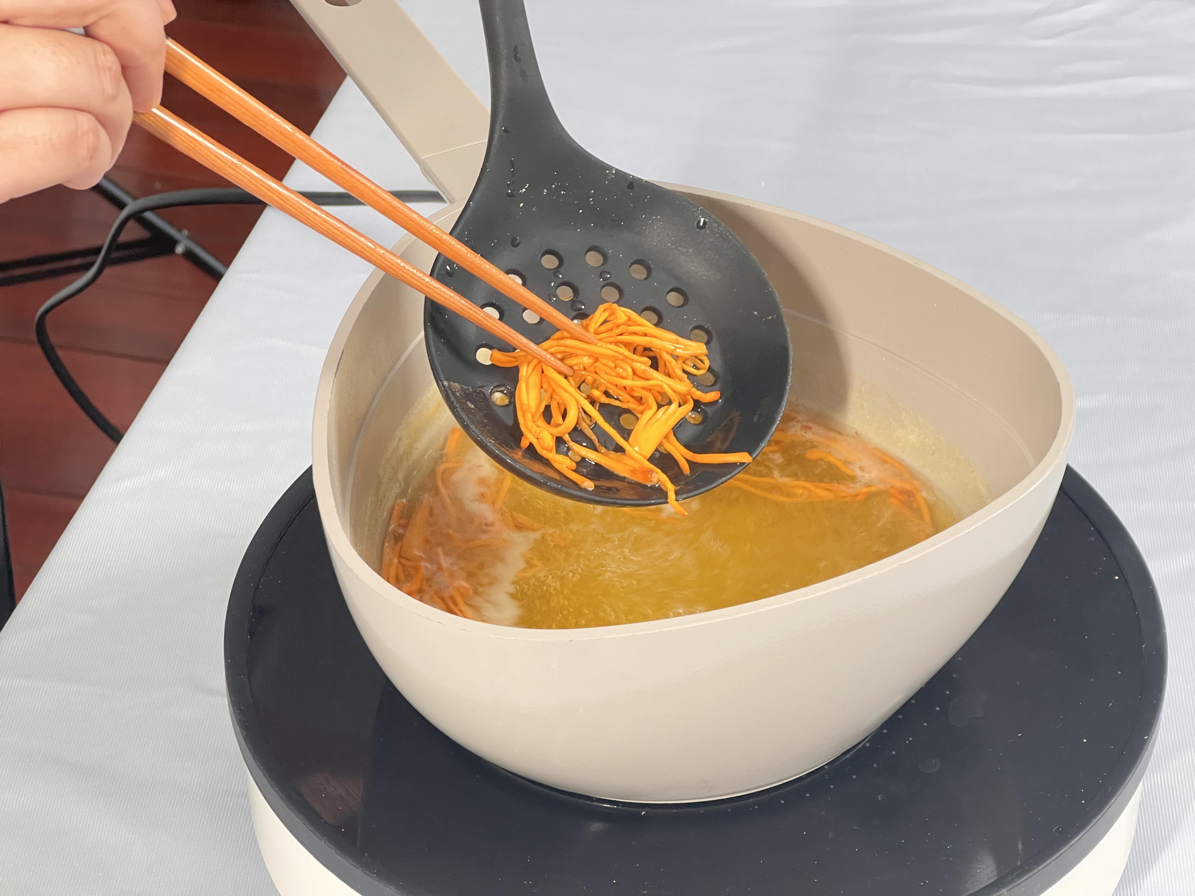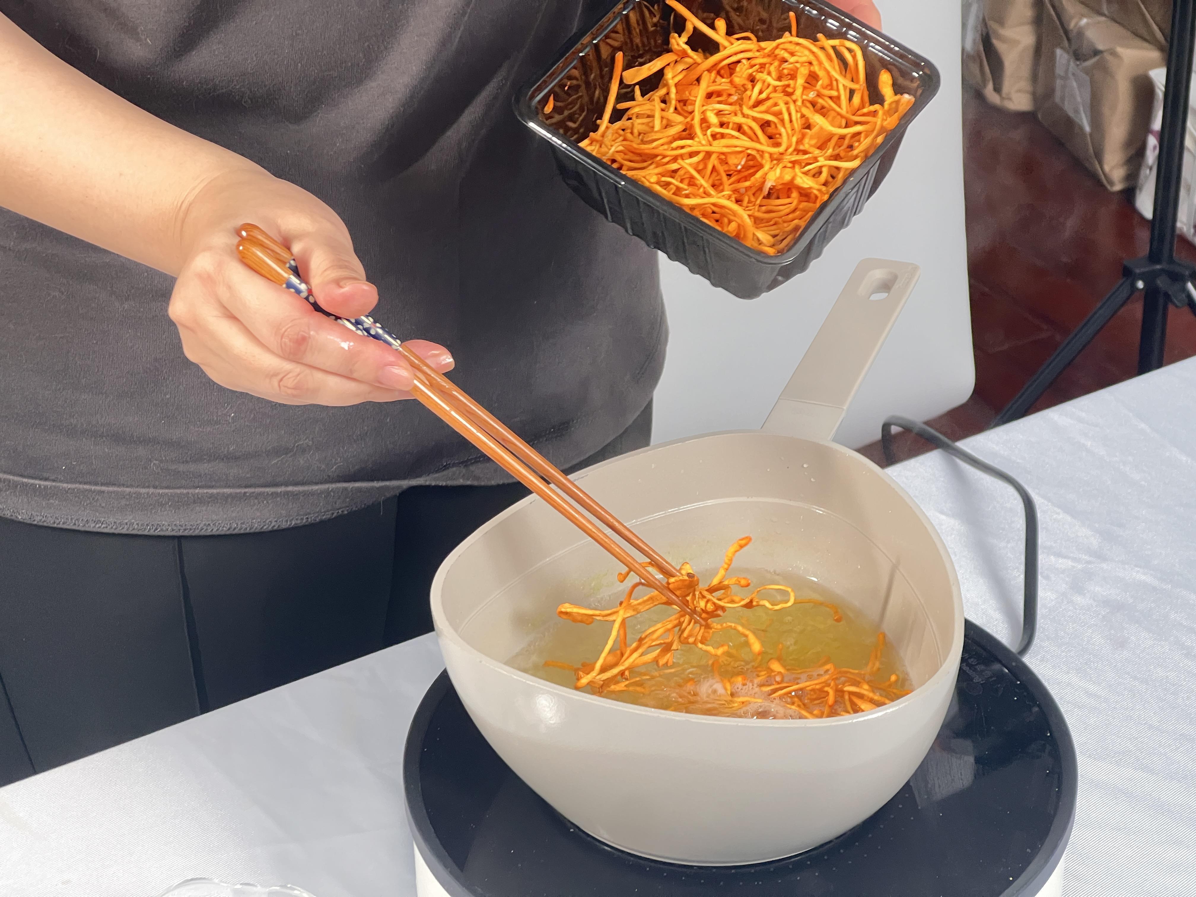 1.少量虫草花清水下锅煮10分钟后,捞出沥水备用。