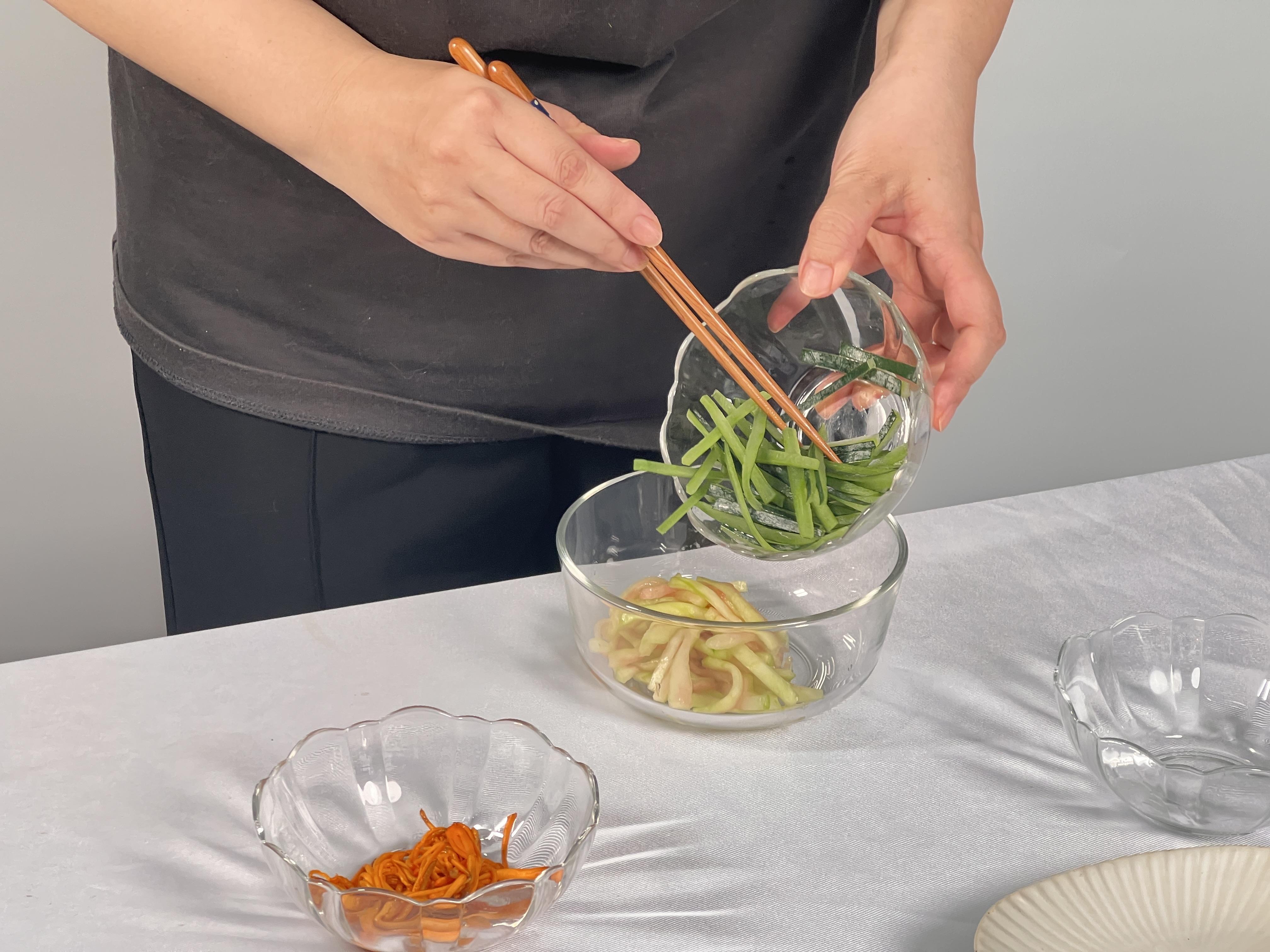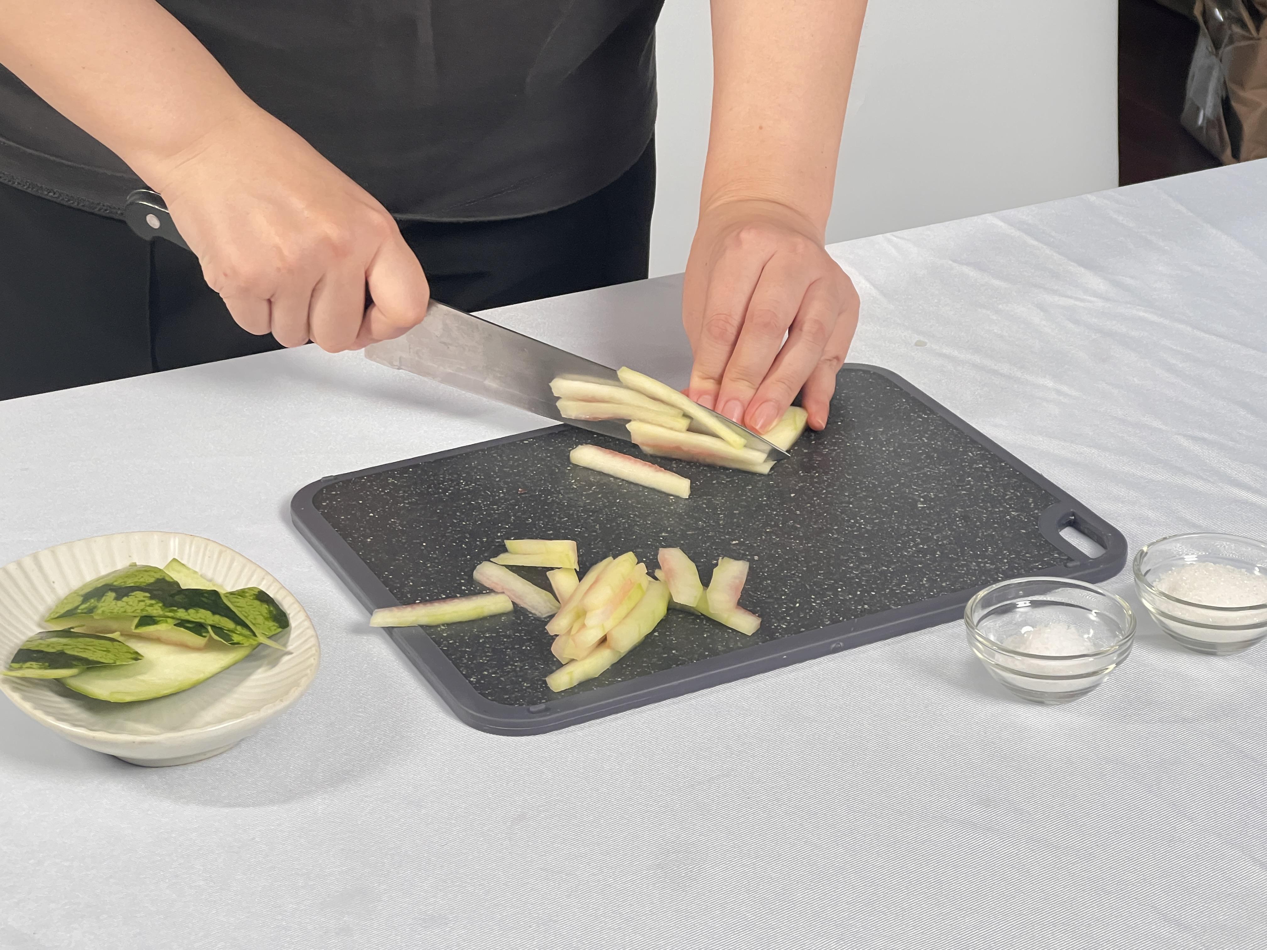 2.西瓜皮去除绿色硬皮,切丝,加入少量食盐腌制三分钟后用清水