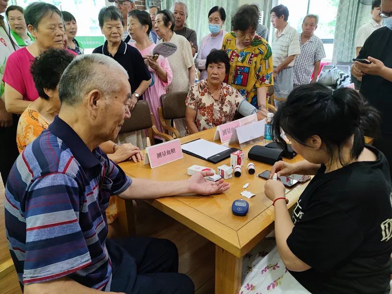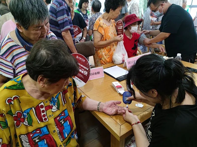 志愿者们在服务中心大厅内设立了便民服务摊位,内容涵盖了健康及养生咨询、防诈宣传、护理、康复咨询、测量血压、测量血糖、理发等,受到了社区老人们的热烈欢迎,尽管天气闷热无比,但前来咨询和接受服务的老人络绎不绝。