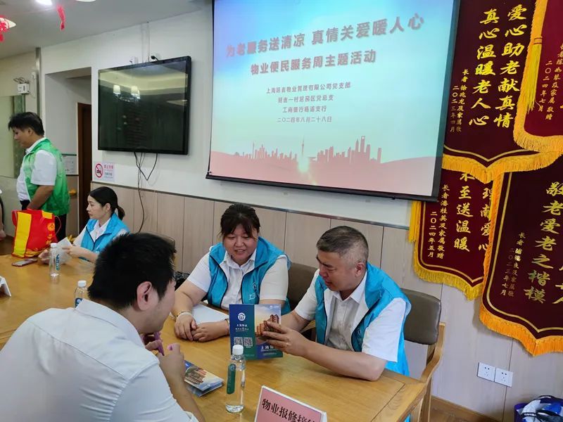 今夏超长版的高温天还在延续,延吉物业的党员们心系社区为老服务中心的老人们。为了激发和弘扬“辛苦我一人,幸福千万家”的物业行业精神,深入推进本市物业便民服务活动增添新的亮点,8月28日上午,上海延吉物业管理有限公司的党员、入党积极分子和业务骨干们,会同延吉一村居民区党总支和工商银行杨浦支行的志愿者们,来到延吉一村居民区为老服务中心,共同开展了以“为老服务送清凉,真情关爱暖人心”为主题的物业便民服务主题党日活动。